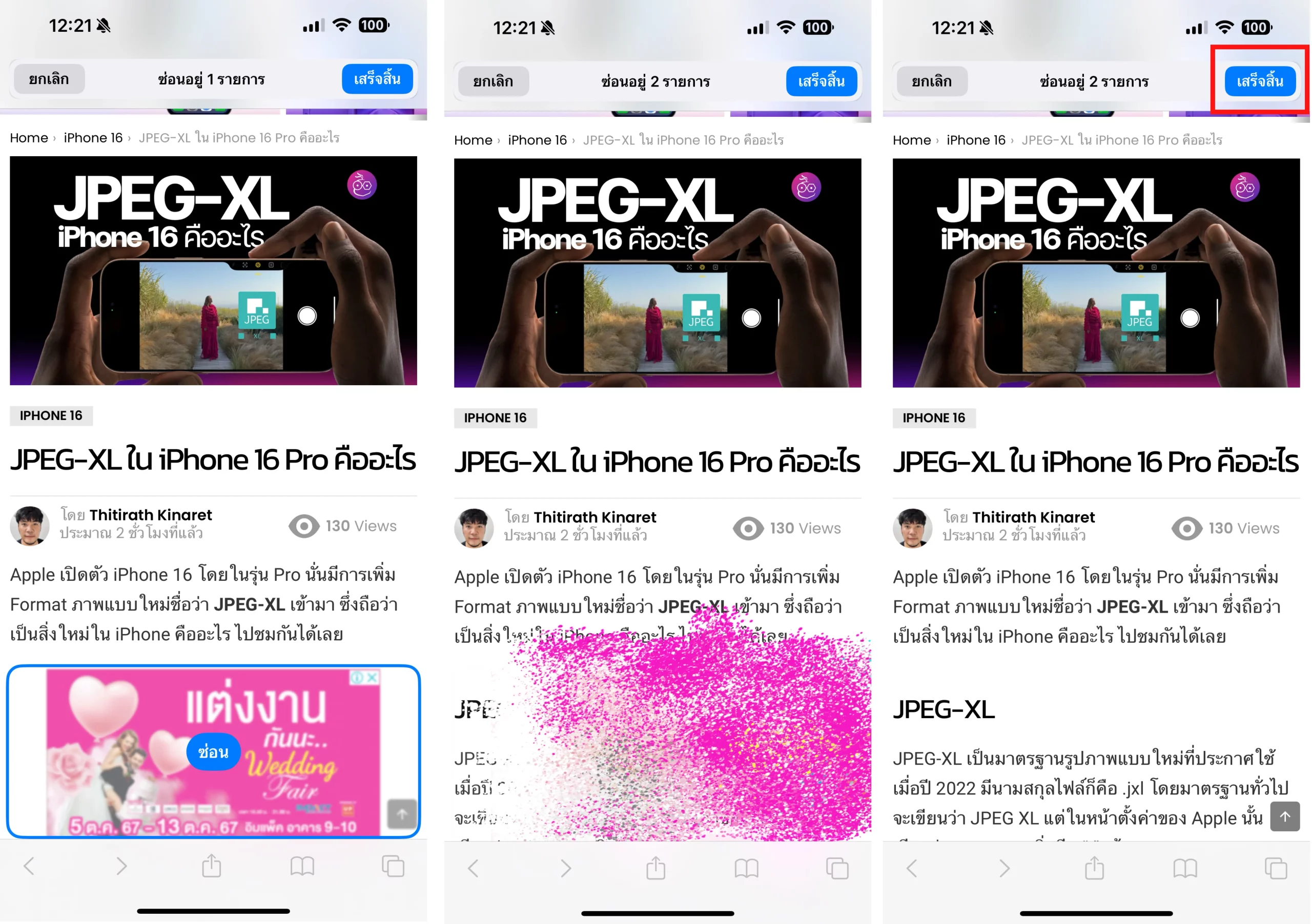 จากนั้นแตะพื้นที่ที่ต้องการซ่อน > แตะ “ซ่อน” > รายการที่เลือกก็จะหายไปจากหน้าเว็บแล้ว > เมื่อซ่อนเสร็จ แตะ “เสร็จสิ้น”