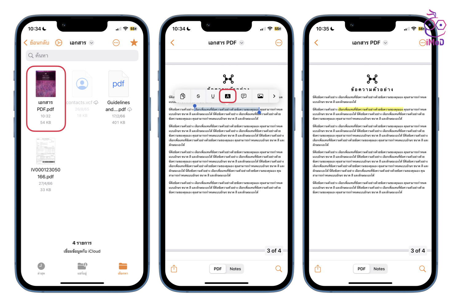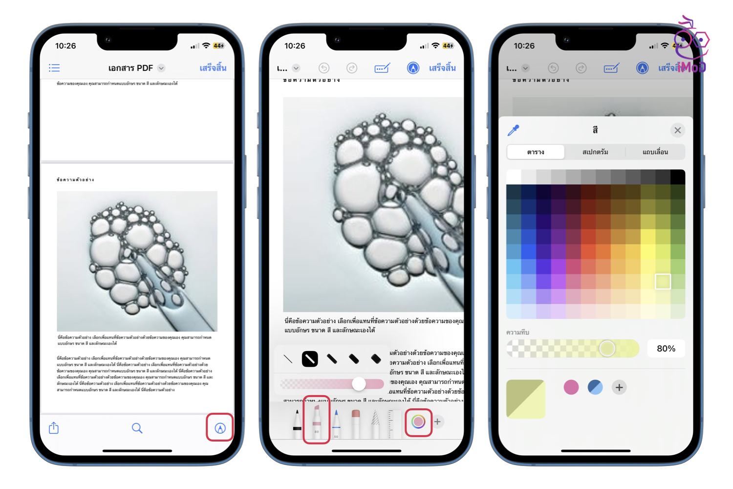 วิธีแรก เราจะใช้เครื่องมือ Mark Up ที่มีติดเครื่อง iPhone, iPad อยู่แล้วมาช่วยในการไฮไลท์และขีดเส้นใต้เอกสาร เริ่มต้นด้วยการเปิดไฟล์ PDF ขึ้นมา แล้วเลือกไอคอน Mark Up มุมล่างขวา > เลือกเครื่องมือปากกาไฮไลท์ ปรับขนาด และความทึบแสงของปากกได้ หากต้องการเปลี่ยนสีให้เลือกไอคอนสี แล้วเลือกสีที่ต้องการได้เลย