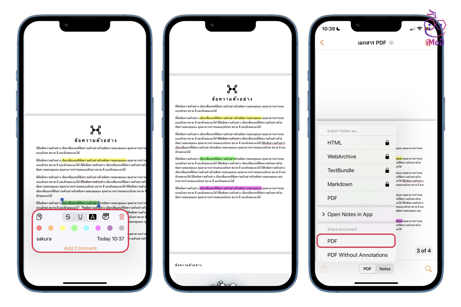 หากเราต้องการปรับแต่งส่วนที่ไฮไลท์หรือทำเครื่องหมายต่าง ๆ ก็สามารถแตะส่วนที่เราทำเครื่องหมาย แล้วเลือกสี หรือการปรับแต่งอื่น ๆ ได้ตามต้องการ เมื่อทำเครื่องหมายเสร็จเรียบร้อยแล้ว ก็แตะปุ่มแชร์ด้านล่างซ้าย แล้วเลือกบันทึกเป็น PDF ได้เลย