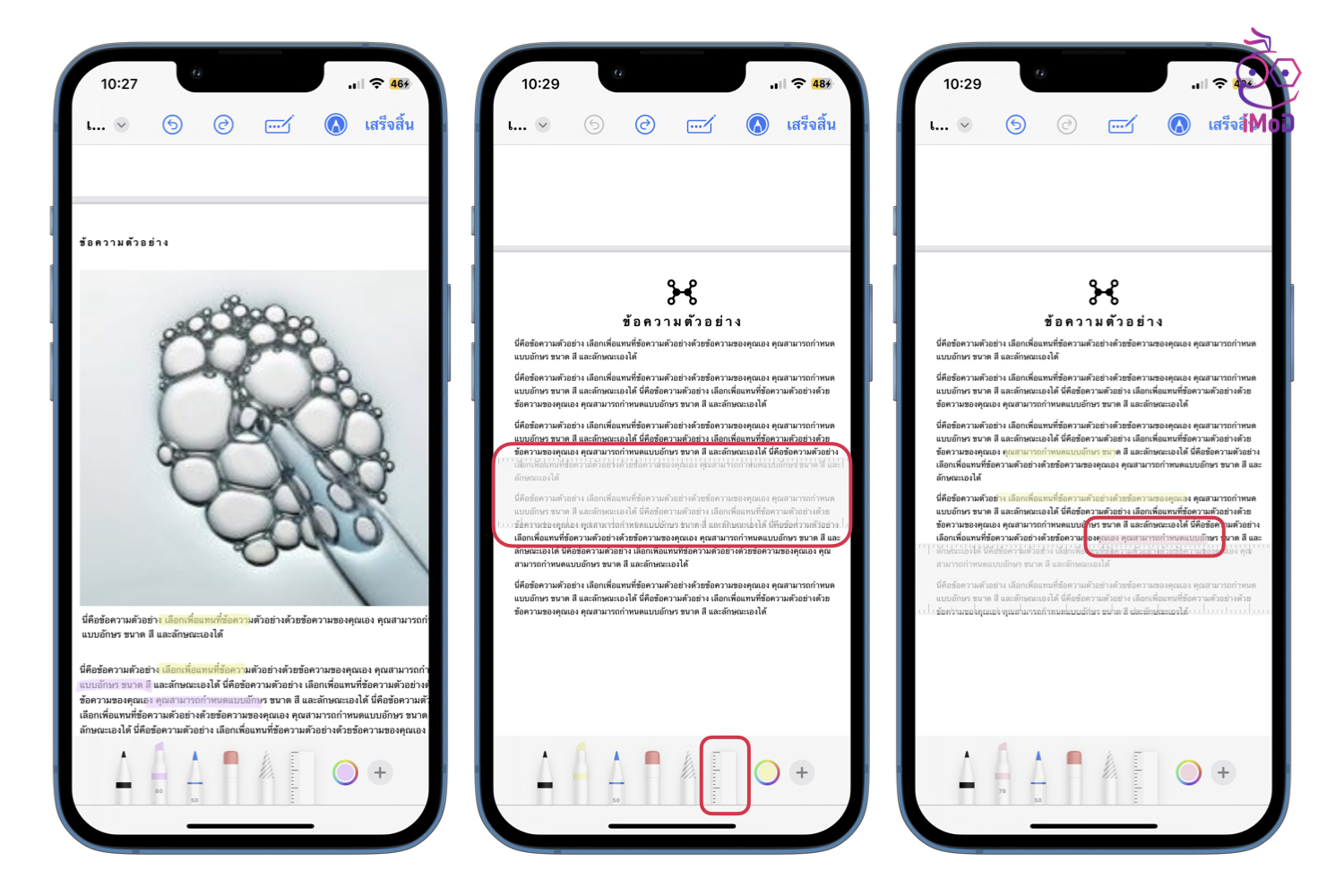 เมื่อปรับแต่งปากกาไฮไลท์แล้ว ก็สามารถลากนิ้วหรือ Apple Pencil ที่ใช้กับ iPad ขีดส่วนที่ต้องการไฮไลท์ได้เลย ในกรณีที่เราต้องการให้การขีดไฮไลท์ตรงสวย ก็สามารถเลือกเครื่องมือไม้บรรทัดมาช่วยได้ โดยลากไม้บรรทัดไปยังตำแหน่งที่ต้องการ จากนั้นก็เลือกปากกาไฮไลท์ขีดบนไม้บรรทัดได้เลย