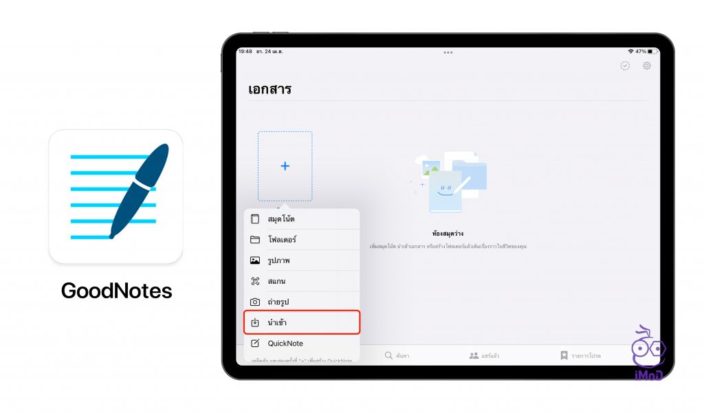 ไปที่แอป GoodNotes > แตะไอคอน + สำหรับสร้างบันทึกใหม่ > เลือก นำเข้า (Import)
