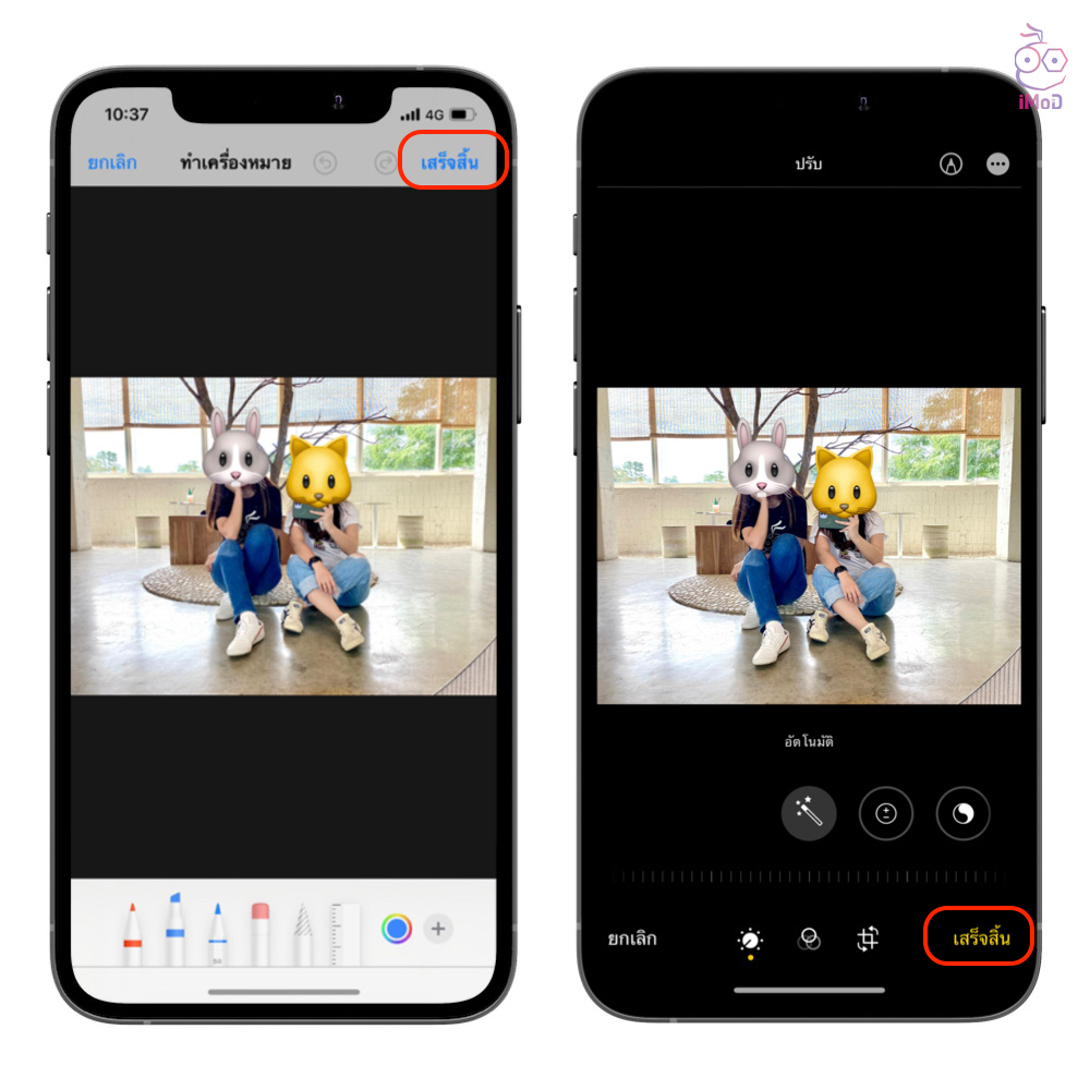 เมื่อปรับแต่งรูปภาพหรือใส่อิโมจิเสร็จแล้ว ให้แตะ เสร็จสิ้น (Done) > แตะเสร็จสิ้นอีกครั้ง