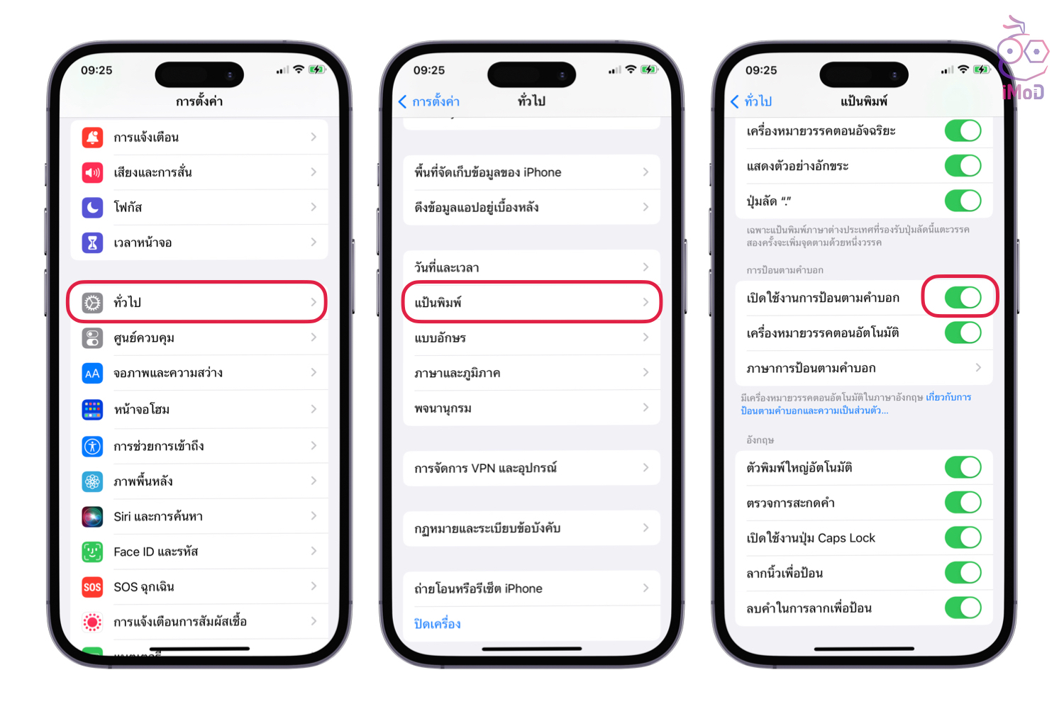 ก่อนอื่นให้เราไปเช็คก่อนว่า เปิดใช้งานการป้อนตามคำบอกแล้วหรือยัง โดยไปที่ การตั้งค่า (Settings) > ทั่วไป (General) > แป้นพิมพ์ (Keyboard) > เปิดใช้งานการป้อนตามคำบอก