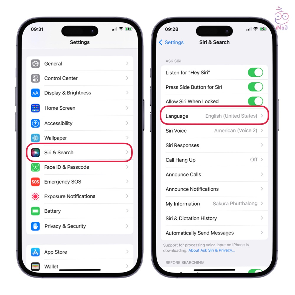 แต่เราจะต้องเปิดใช้งาน ฟัง Hey Siri, กดปุ่มด้านข้างเพื่อคุยกับ Siri หรือ อนุญาตใช้ Siri ขณะล็อกในส่วนการตั้งค่า Siri และการค้นหาก่อน ที่สำคัญ ให้เปลี่ยนภาษาของ Siri เป็นภาษาที่รองรับด้วย ตัวอย่างเปลี่ยนเป็นภาษาอังกฤษ