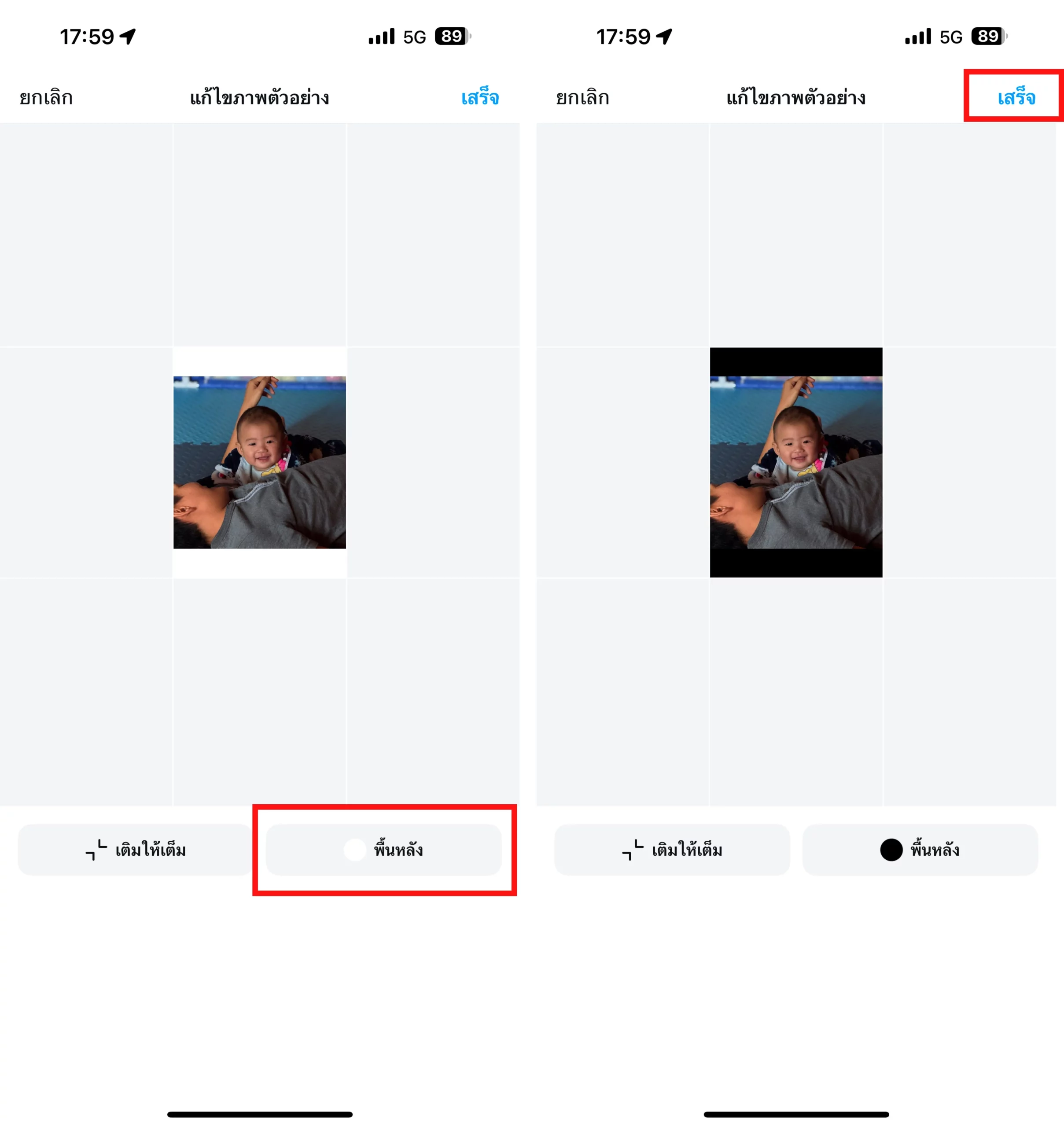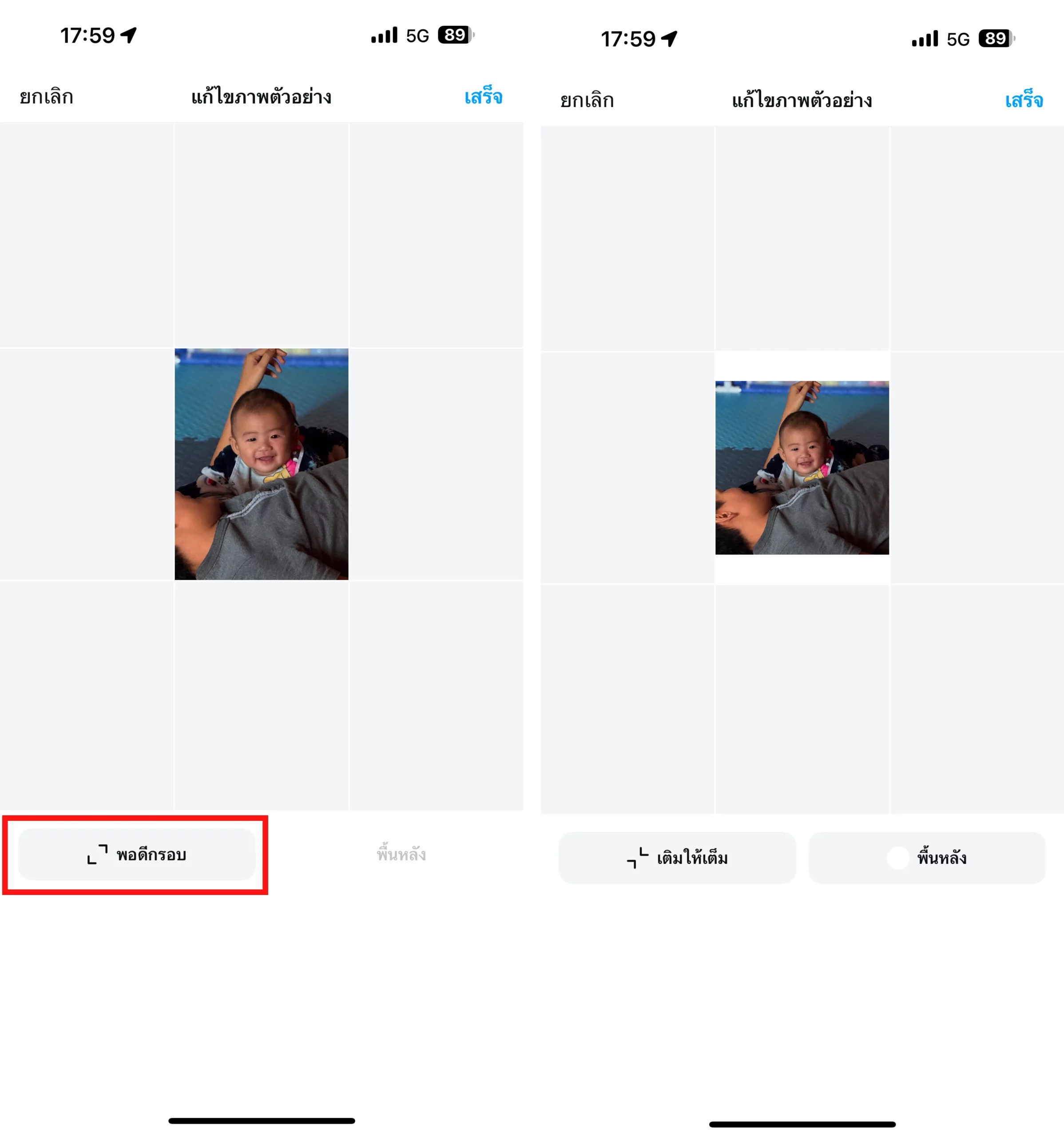 - พอดีกรอบ < >: ภาพจะแสดงในกรอบ 4:5 แบบพอดี เหมาะสำหรับรูปภาพที่เป็นแบบจัตุรัส 1:1 มาก่อน แล้วต้องการปรับขนาดให้อยู่ในกรอบ 4:5 แบบไม่ถูกตัดออก