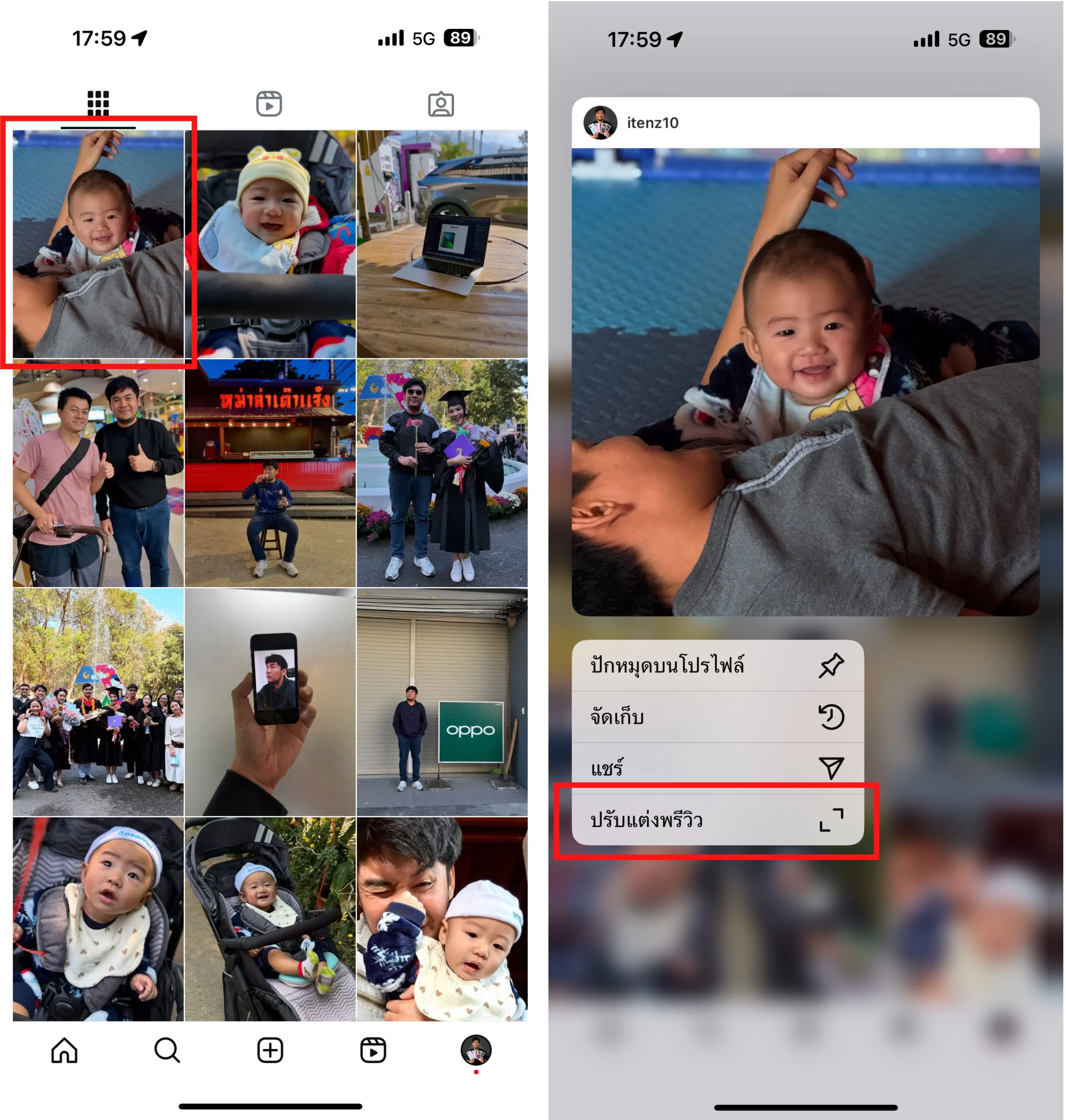 สำหรับวิธีปรับขนาดภาพใน Grid ให้กลับมาแสดงแบบ 1:1 นั้นทำได้โดย แตะที่รูปค้างไว้ > เลือก “ปรับแต่งพรีวิว”