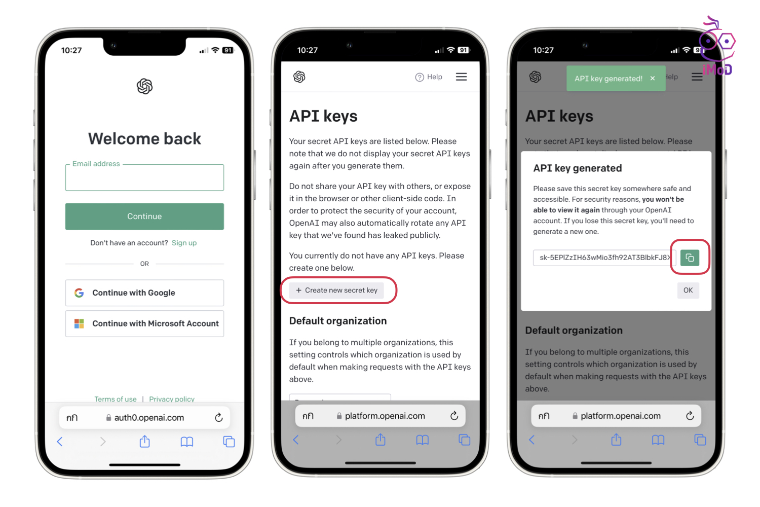 ให้เราไปรับ API-KEY ของ Chat GPT ที่เว็บไซต์ https://platform.openai.com/account/api-keys แล้วลงชื่อเข้าใช้ (ใครที่ยังไม่ได้สมัครสมาชิก ให้สมัครให้เรียบร้อยก่อน ชมวิธีที่นี่) > เลือก Create new secret key > คัดลอก API เก็บไว้
