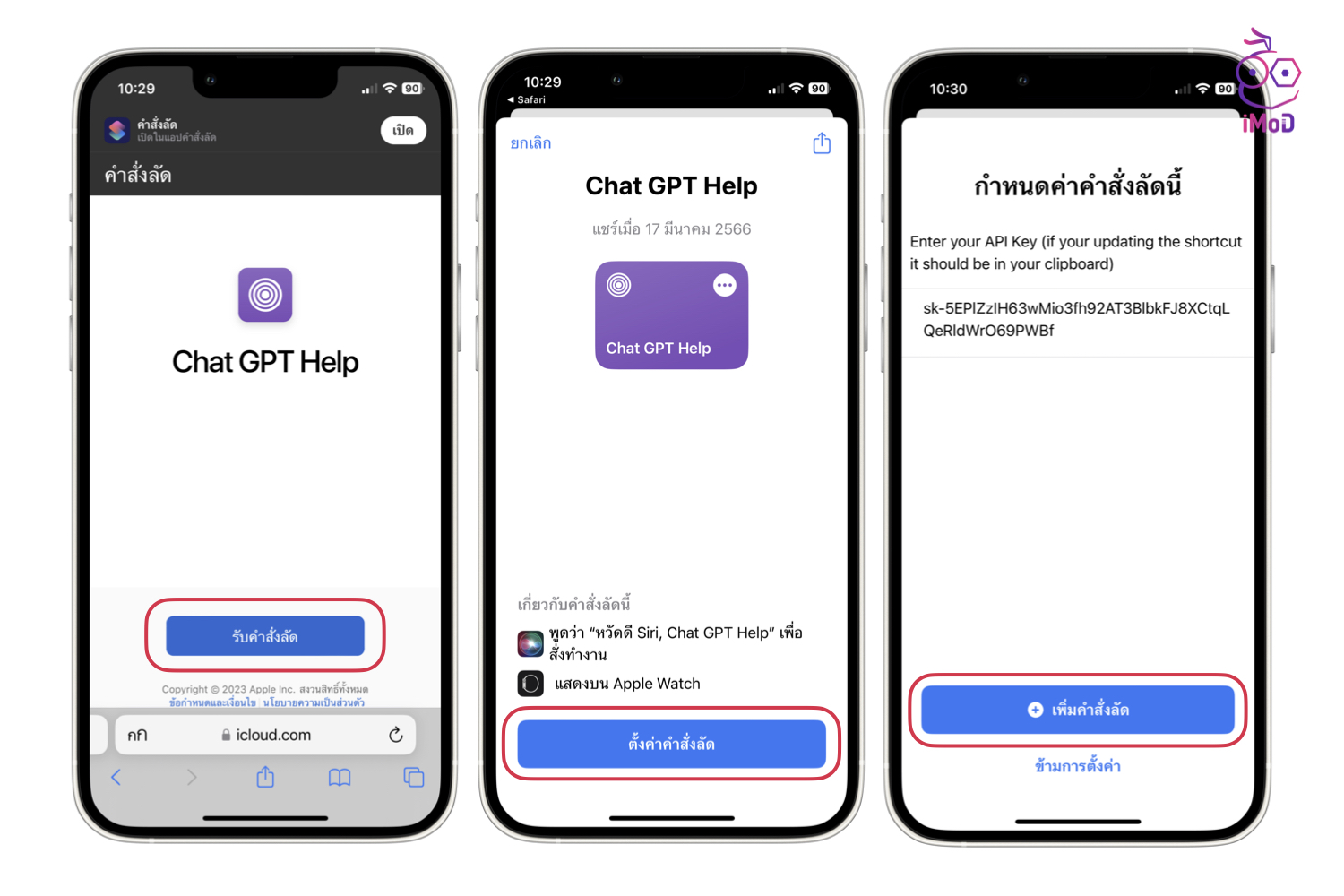 รับคำสั่งลัด Chat GPT Help [รับคำสั่งลัดที่นี่] มาติดตั้งบน iPhone > แตะ รับคำสั่งลัด > ตั้งค่าคำสั่งลัด > ใส่ API-KEY ที่เราคัดลอกเก็บไว้ในขั้นตอนที่ 1 โดยการวางคีย์ลงไป แล้วแตะ เพิ่มคำสั่งลัด