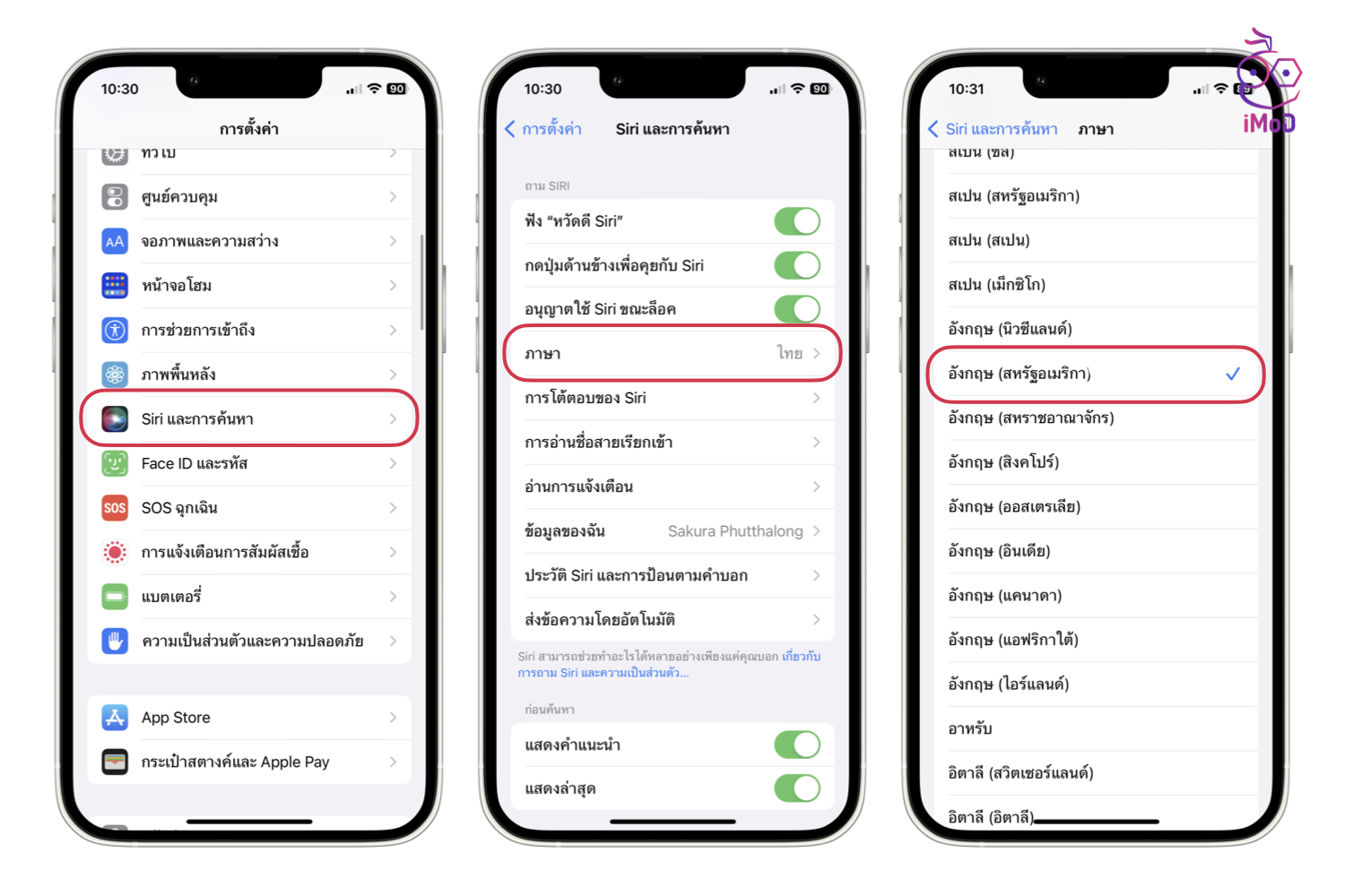 วิธีตั้งค่าภาษาให้กับ Siri ให้ไปที่ การตั้งค่า (Settings) > Siri และการค้นหา (Siri & Search) > ภาษา (Language) > เลือก อังกฤษ (สหรัฐอเมริกา)
