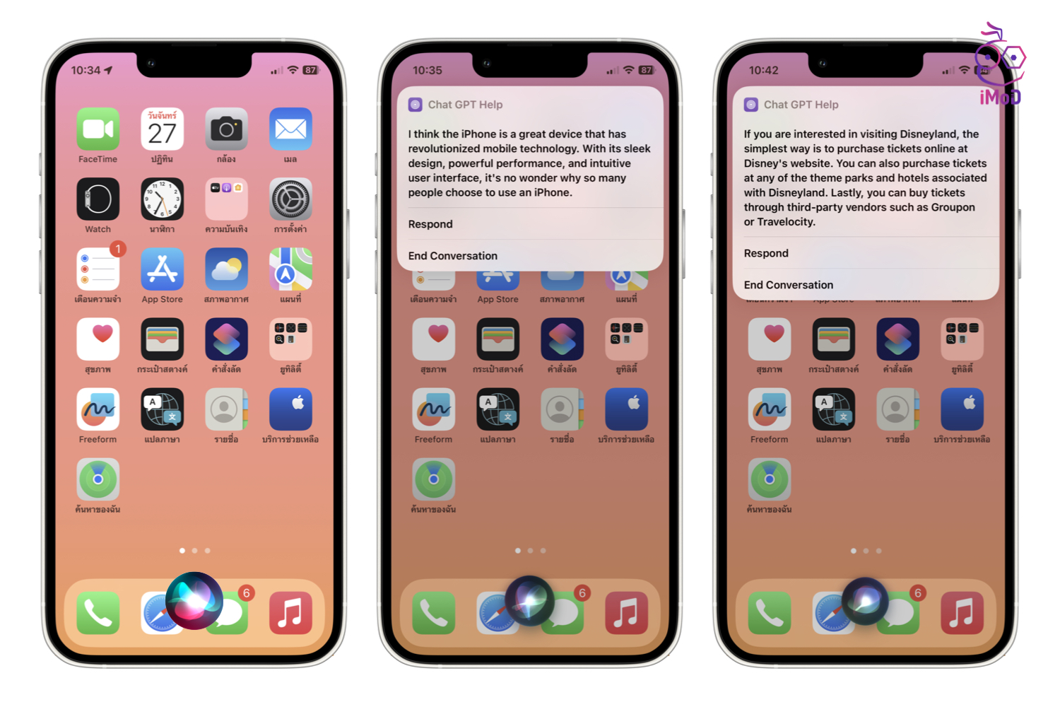 เริ่มต้นด้วยการพูดว่า Hey Siri, Chat GPT Help > จากนั้นก็ถามสิ่งที่ต้องการได้เลย > Chat GPT ก็จะตอบคำถามเชิงอธิบายให้ข้อมูบและ Siri ก็จะอ่านคำตอบให้ด้วย