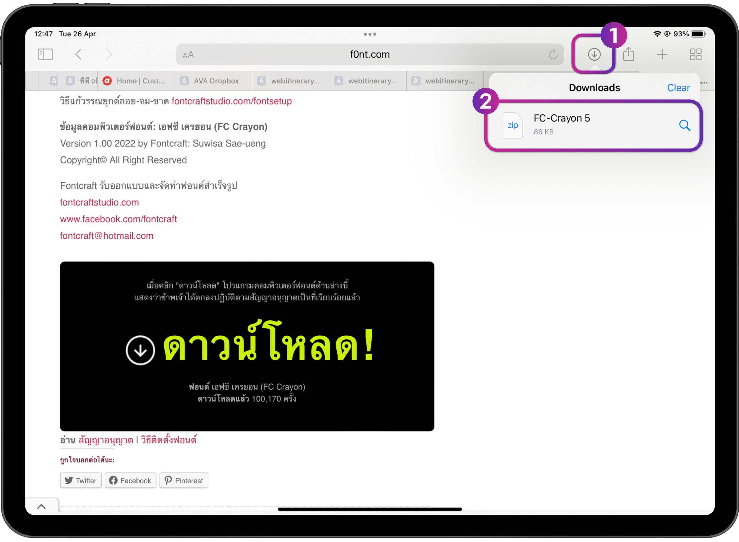 2. แตะลูกศรดาวน์โหลดมุมบนขวา จะขึ้นรายการที่เราดาวน์โหลดไว้ > แตะฟอนต์ที่ดาวน์โหลด