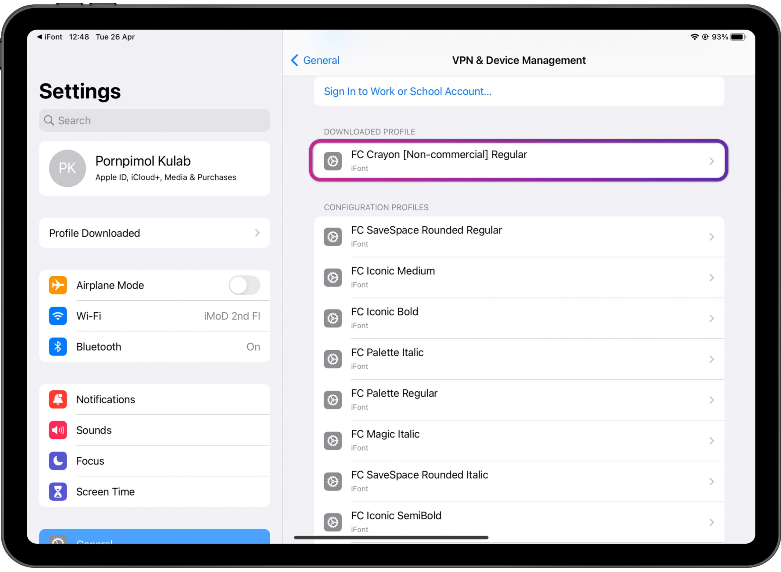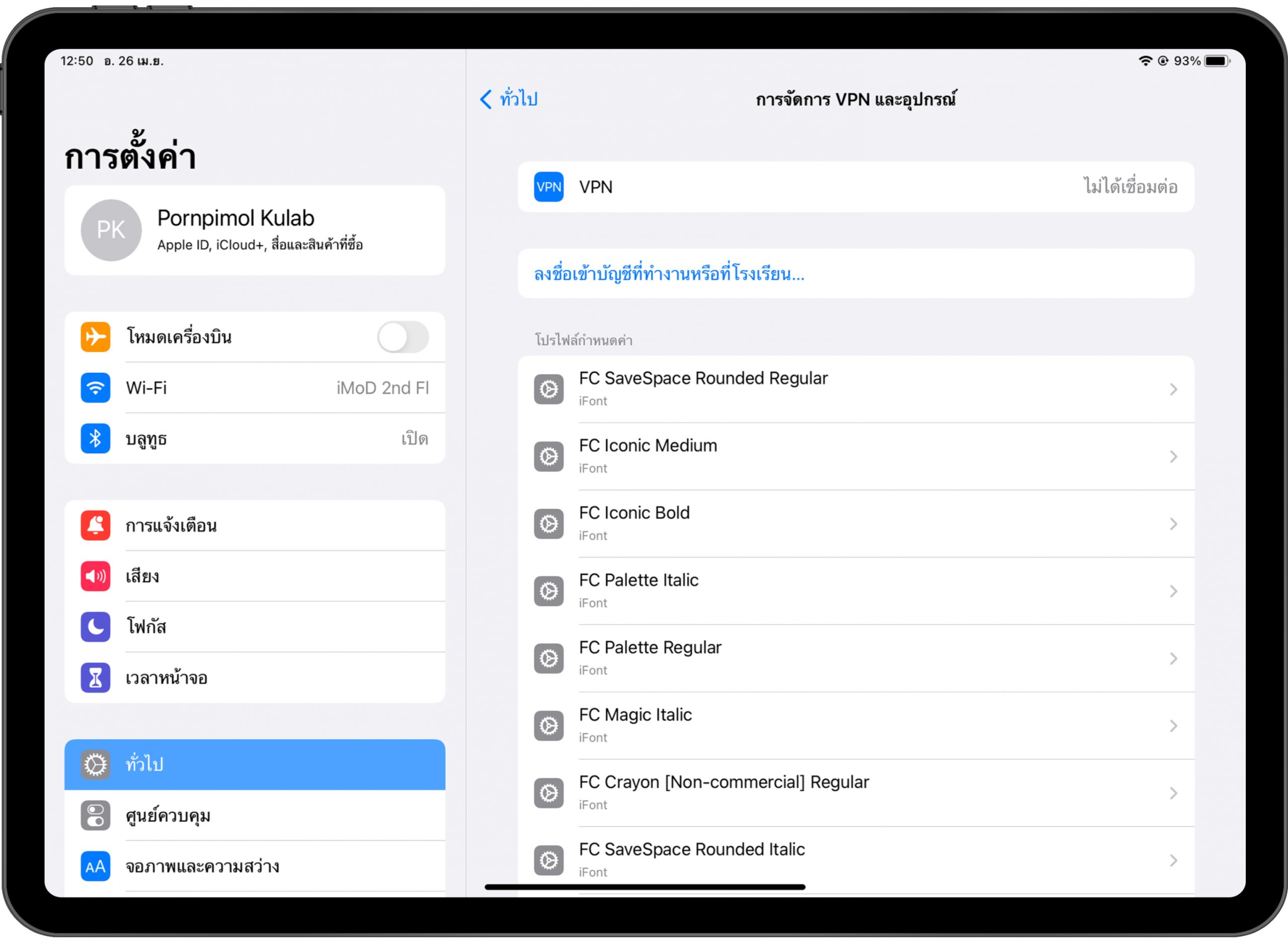 รายการฟอนต์ที่ติดตั้งแล้วจะอยู่ในเมนู การตั้งค่า > ทั่วไป > รายการ VPN และอุปกรณ์