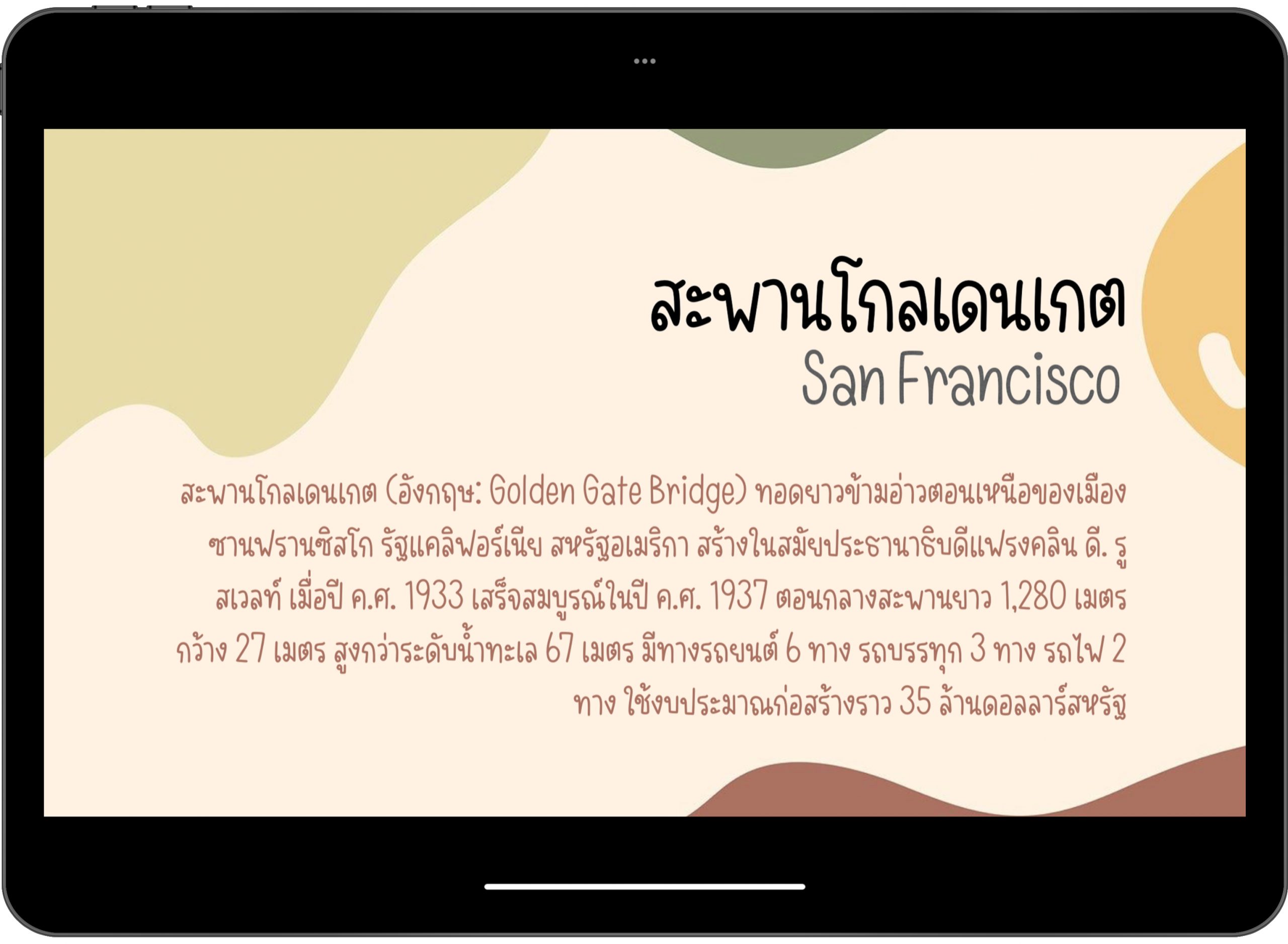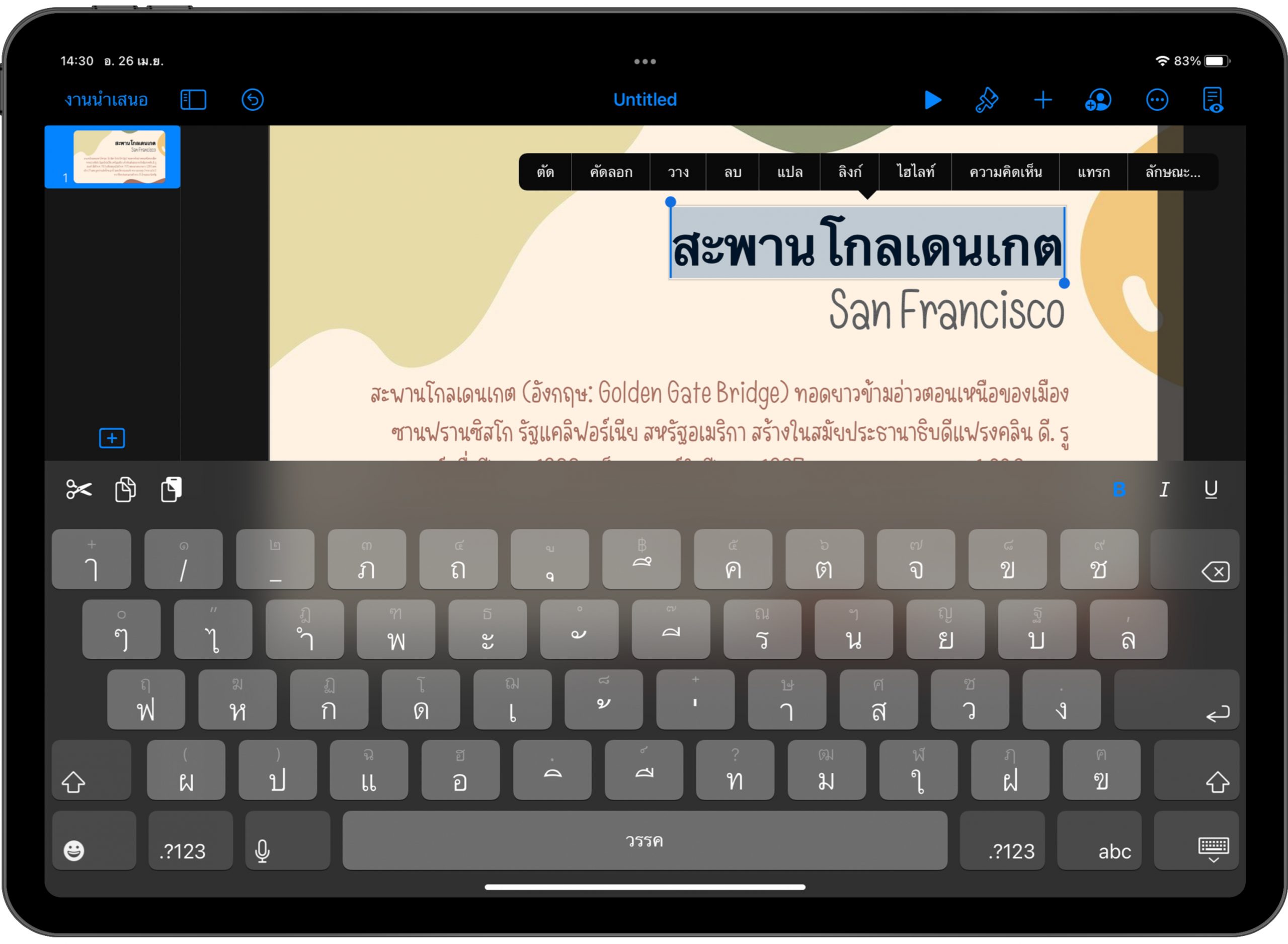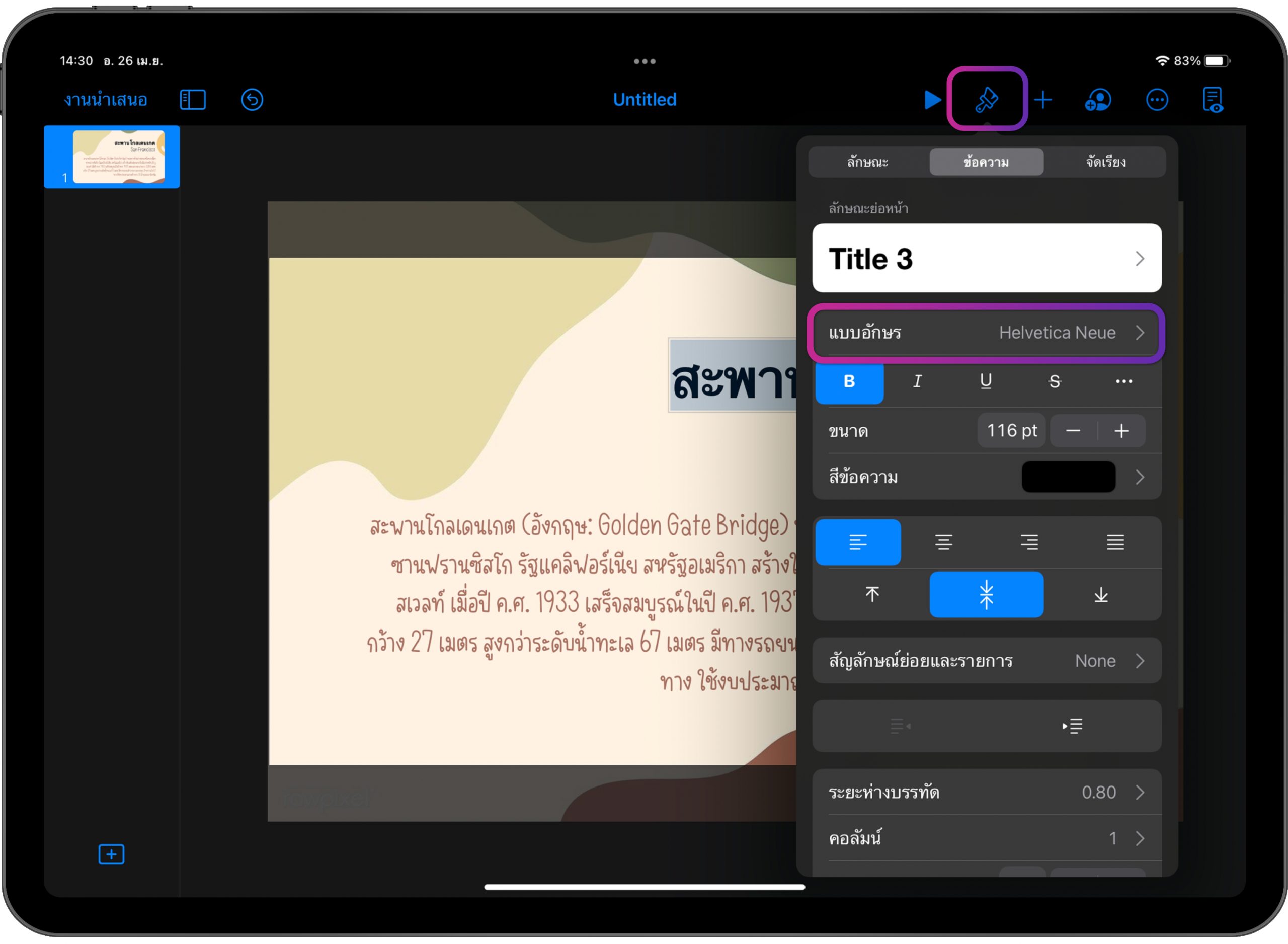 ยกตัวอย่างแอป Keynote บน iPad เพียงแค่เราเลือกข้อความที่เราต้องการเปลี่ยนฟอนต์ แล้วไปที่ไปคอนแปรงทาสี > แบบอักษร > เลือกฟอนต์ที่ติดตั้งไว้ได้เลย เพียงแค่นี้ก็ได้ฟอนต์น่ารัก ๆ มาใช้งานแล้ว