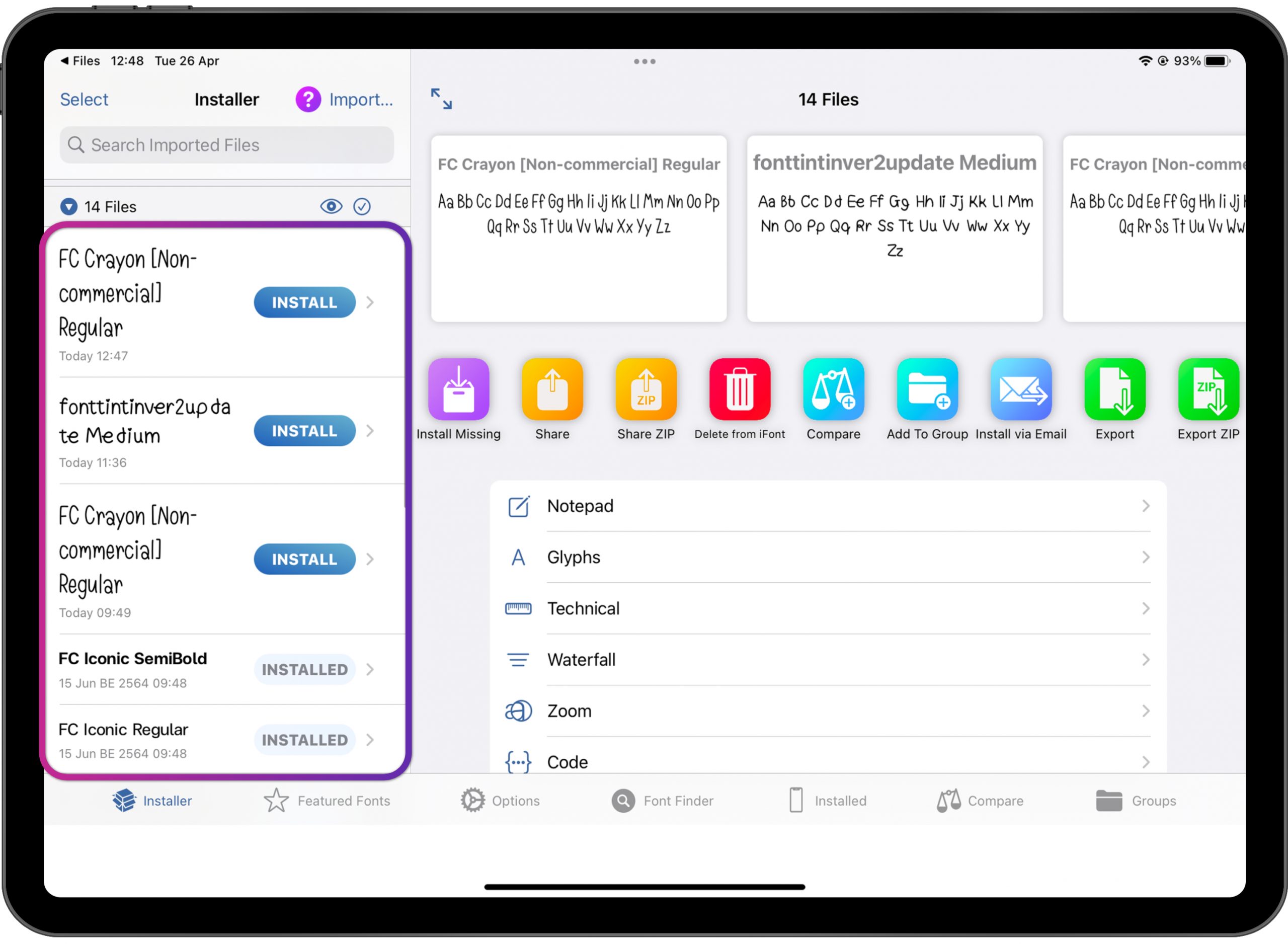7. จากนั้นจะลิงค์ไปที่แอป iFont > จะปรากฎรายการฟอนต์ที่ดาวน์โหลดมาในแถบด้านซ้าย > แตะ install