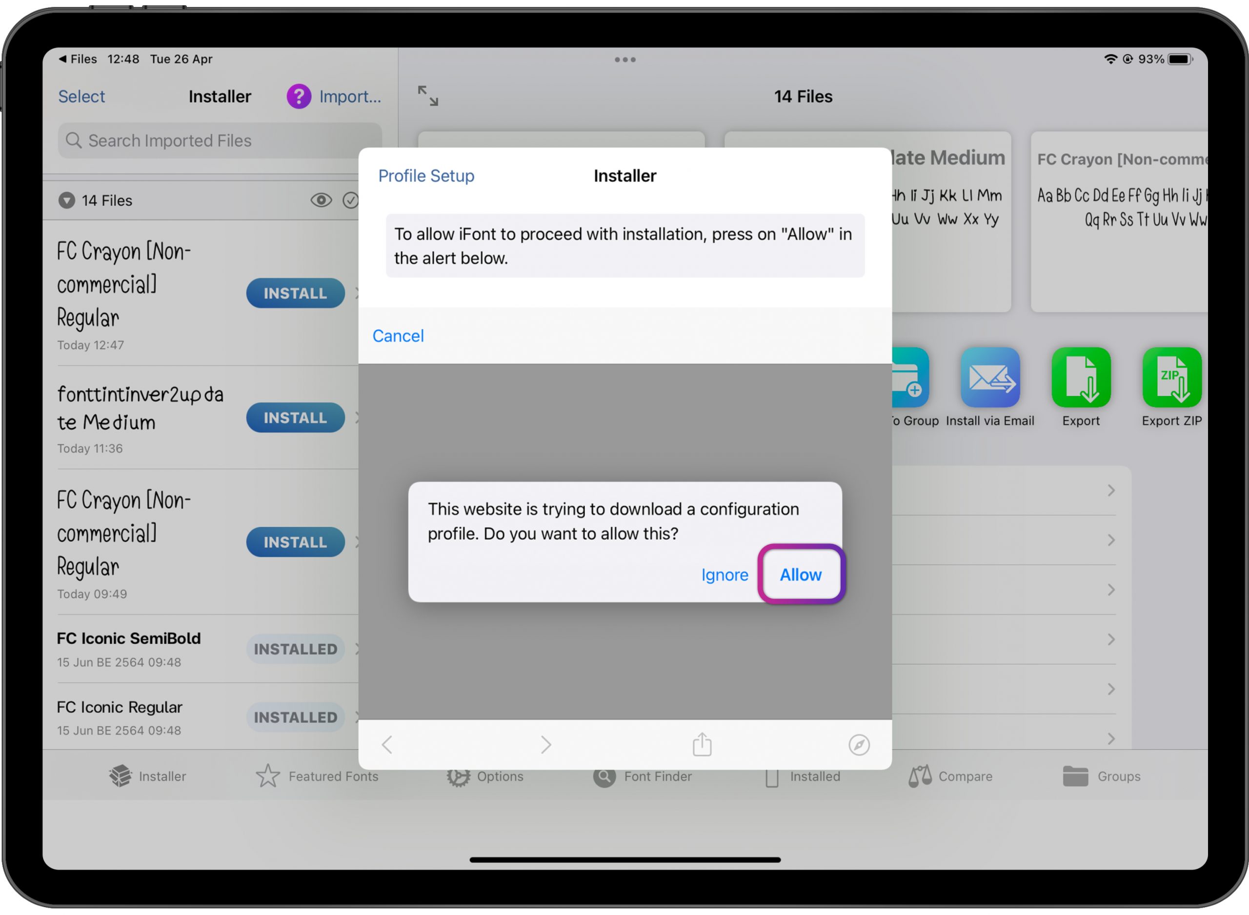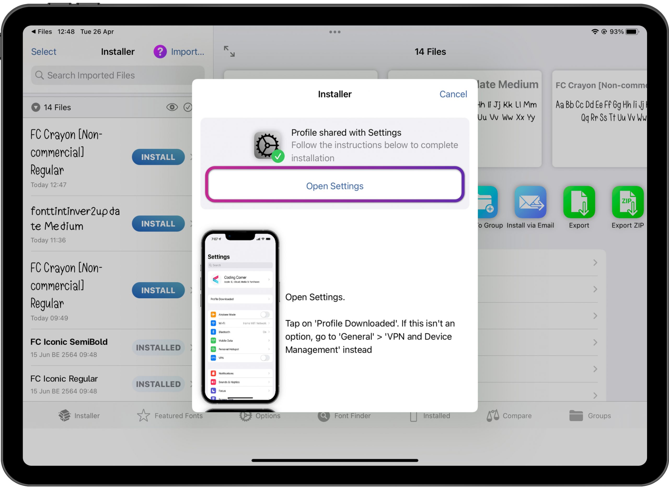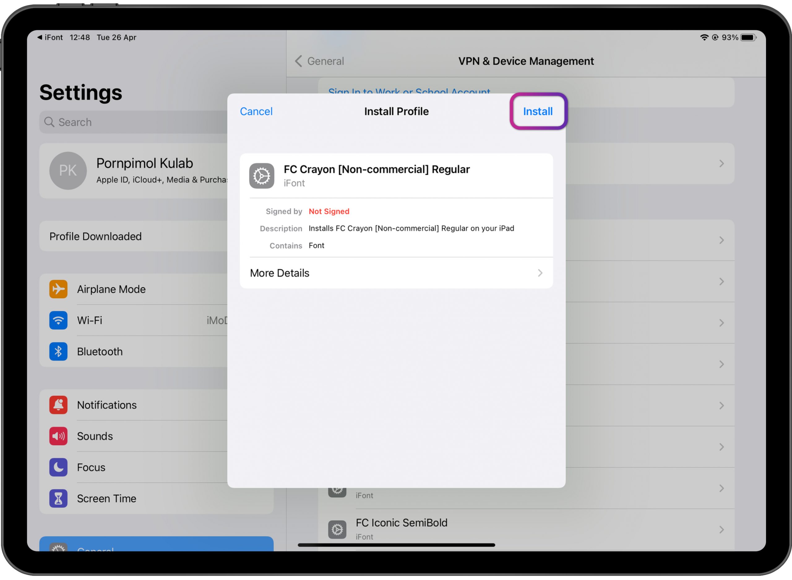 9. แตะฟอนต์ใน Downloaded Profile > Install > กรอกรหัสผ่านเครื่อง