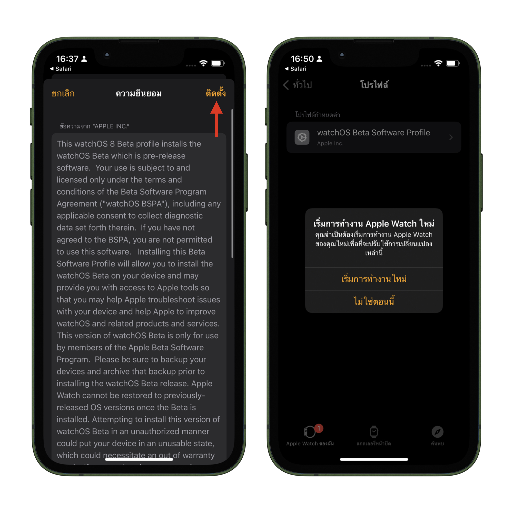 รอให้อุปกรณ์อัปเดต watchOS 9 Public beta Profile เสร็จสิ้น อุปกรณ์จะ Reboot ใหม่ (บางเครื่องจะขึ้นให้กด)