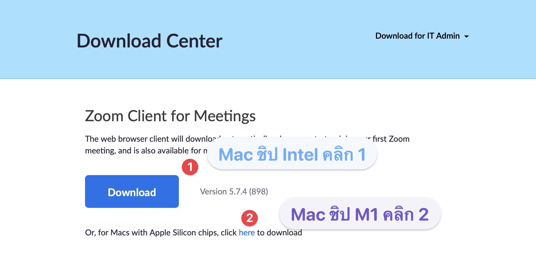 หากเครื่อง Mac ใช้ชิป Intel ให้เลือกตามหมายเลข 1 ส่วนรุ่นที่ใช้ชิป M1 ให้เลือกหมายเลข 2