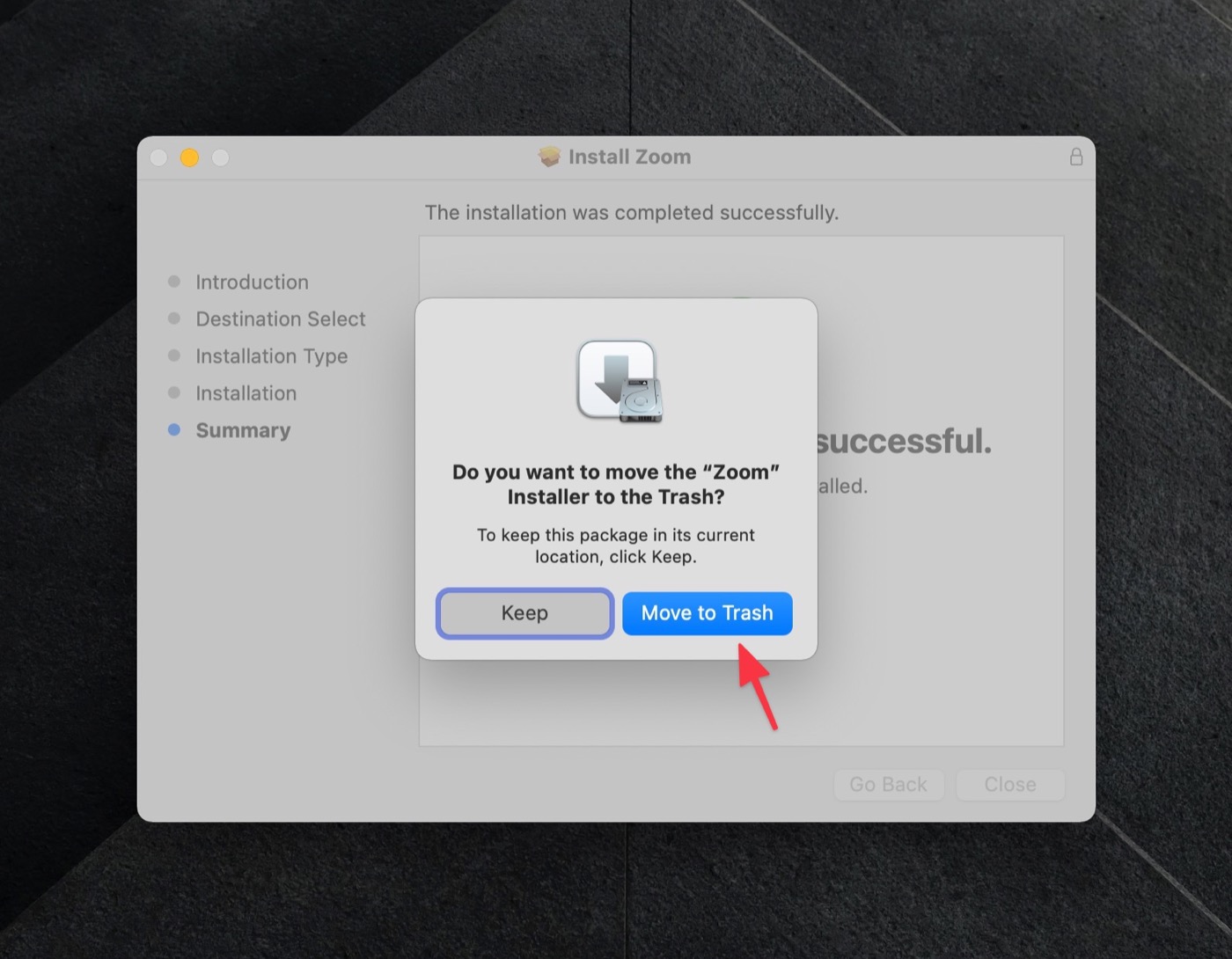 หน้าต่อมาให้ลบไฟล์ติดตั้งได้เลยโดยกดที่ Move to Trash