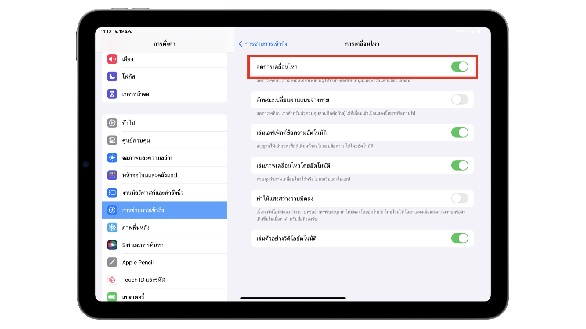 ไปท่ีการตั้งค่า > การช่วยการเข้าถึง > การเคลื่อนไหว > เลื่อนเปิด “ลดการเคลื่อนไหว”