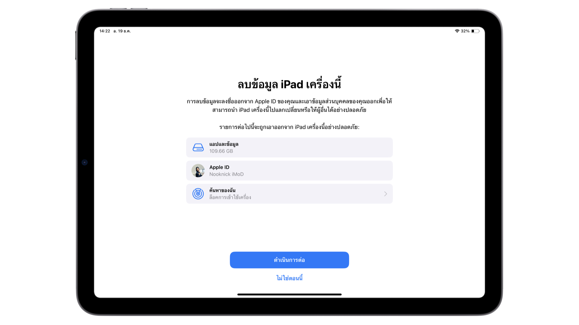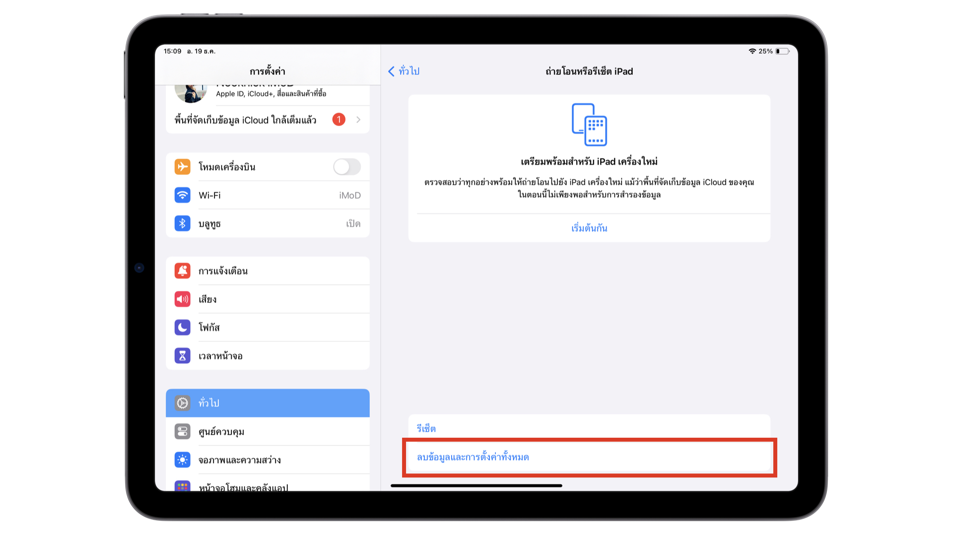ไปที่การตั้งค่า > ทั่วไป > เลือกทั่วไป > ถ่ายโอนหรือรีเซ็ต iPad > เลือก “ลบข้อมูลและการตั้งค่าทั้งหมด” > แตะ “ดำเนินการต่อ” > ทำตามคำแนะนำบนหน้าจอเพื่อรีเซ็ต iPad