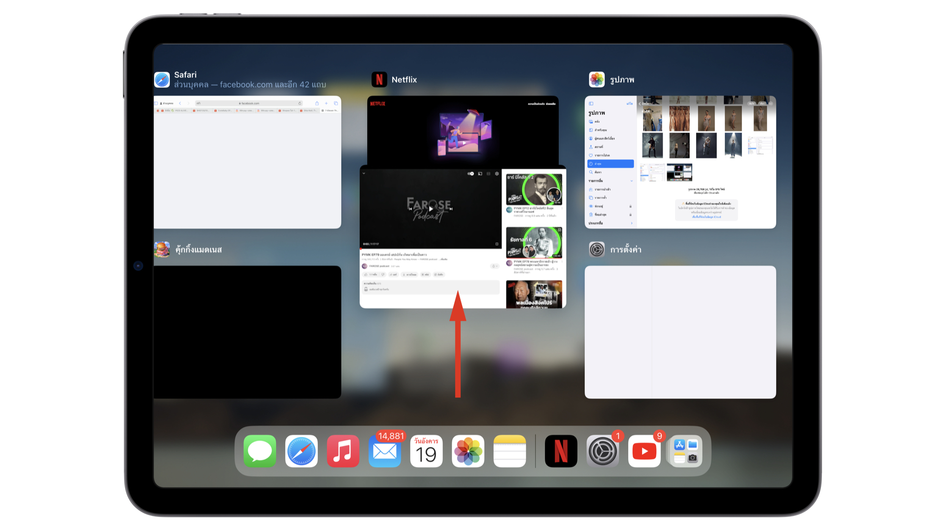 ปัญหา iPad ทำงานช้า บางครั้งอาจเกิดจากบางแอปที่ทำงานอยู่เบื้องหลังแล้วใช้ RAM หรือทรัพยากรอื่นๆ โดยไม่จำเป็น ซึ่งวิธีที่ง่ายและเร็วที่สุดคือการปิดแอปเหล่านั้นทิ้งไป ด้วยการแตะที่ตัวแอปแล้ว “ปัด” ทิ้งขึ้นไปด้านบนจอ