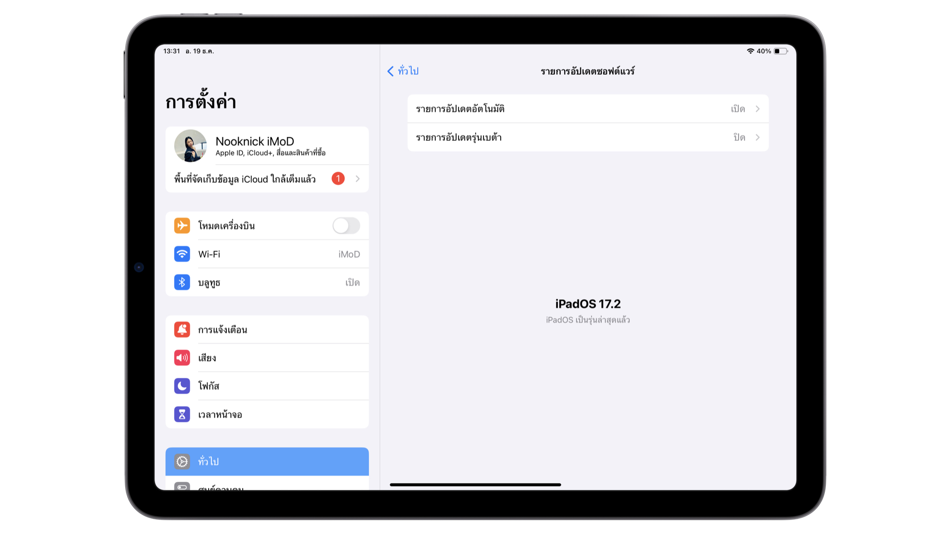 ไปที่การตั้งค่า > ทั่วไป > รายการอัปเดตซอฟต์แวร์ > เช็คว่าเป็น iPadOS รุ่นล่าสุดหรือไม่ ถ้าหากมีการอัปเดตก็ให้เลือกดาวน์โหลดและติดตั้ง เพื่ออัปเดตเป็นซอฟต์แวร์เวอร์ชันล่าสุด