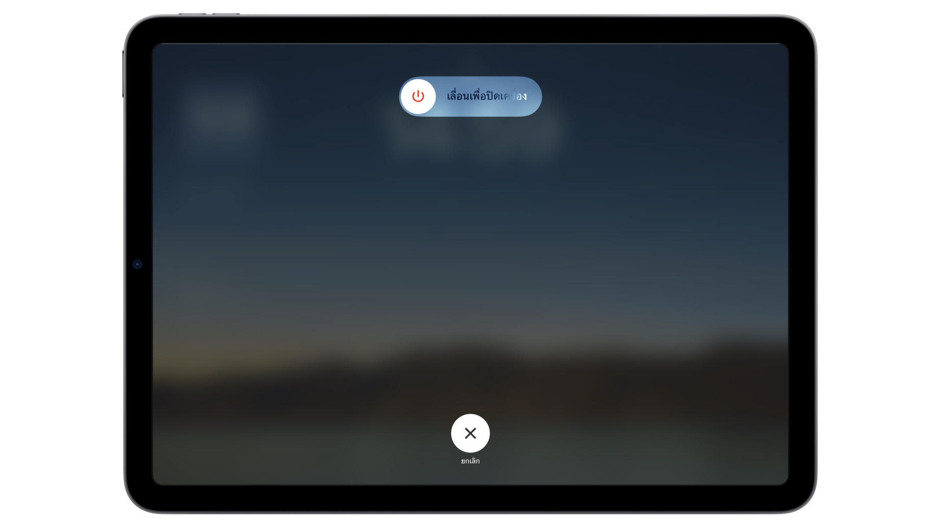 วิธีการรีสตาร์ททำได้โดยการ “กดปุ่ม Power + ปุ่มระดับเสียง” ค้างไว้พร้อมกัน > เลื่อนแถบเลื่อนบนหน้าจอเพื่อปิดเครื่อง iPad