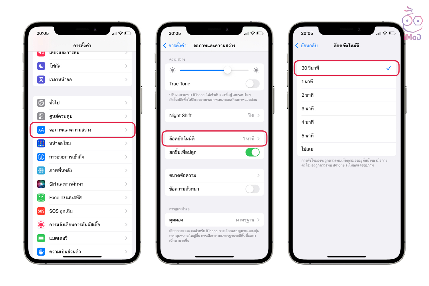 ไปที่ การตั้งค่า (Settings) > จอภาพและความสว่าง (Display & Brightness) > ล็อคอัตโนมัติ (Auto-Lock) > แนะนำให้ตั้งเวลาล็อกนาจอ 30 วินาทีหรือ 1 นาที