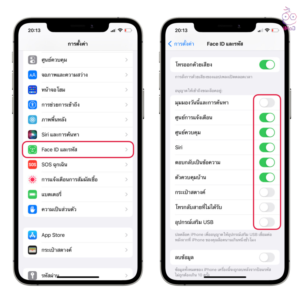 เราสามารถตั้งค่าให้เข้าถึงส่วนต่าง ๆ ขณะล็อกหน้าจอได้ ไม่ว่าจะเป็น มุมมองวันนี้และการค้นหา, ศูนย์การแจ้งเตือน, ศูนย์ควบคุม, Siri, การตอบกลับข้อความ ฯลฯ ซึ่งข้อมูลบางอย่างอาจจะละเอียดอ่อนหรือสำคัญมาก ๆ ดังนั้นพิจารณาให้ดีว่า เราจะเปิดให้เข้าถึงข้อมูลส่วนไหนได้บ้าง ขณะที่ล็อกเครื่องอยู่