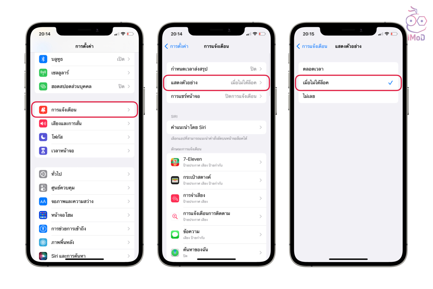 ไปที่ การตั้งค่า (Settings) > การแจ้งเตือน (Notification) > แสดงตัวอย่าง (Preview) > แตะเลือก เมื่อไม่ได้ล็อค (When Unlock)