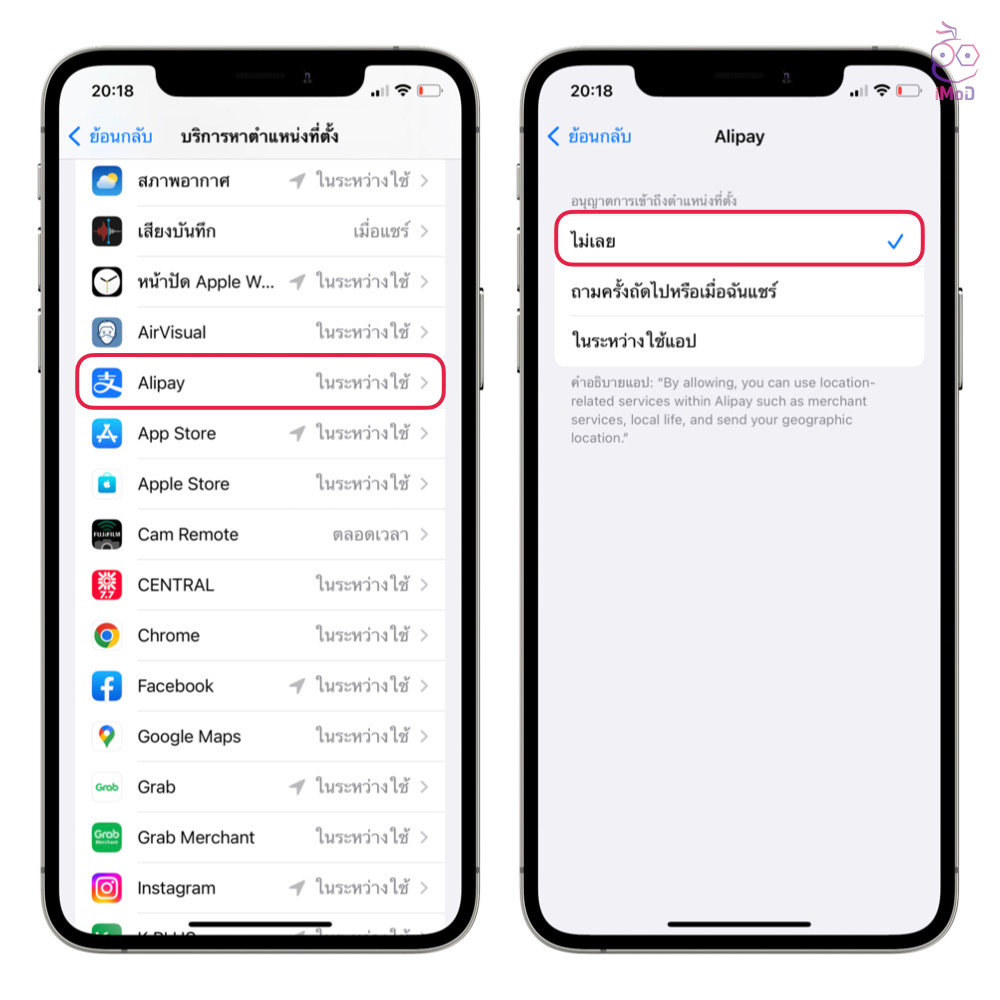 บางแอปจะต้องเข้าถึงตำแหน่งที่ตั้งของเรา เช่น Grab, Uber หรือแอปจำพวกแอปนำทางต่าง ๆ แต่บางแอปก็สามารถทำงานได้โดยที่ไม่จำเป็นต้องใช้ตำแหน่งที่ตั้ง เพราะอาจจะใช้การติดตามตำแหน่งเพื่อนำข้อมูลไปทำการโฆษณา ดังนั้น ก็ลองพิจารณาให้ดีว่าเราจะปิดใช้งานการเข้าถึงตำแหน่งที่ตั้งของแอปใดบ้าง