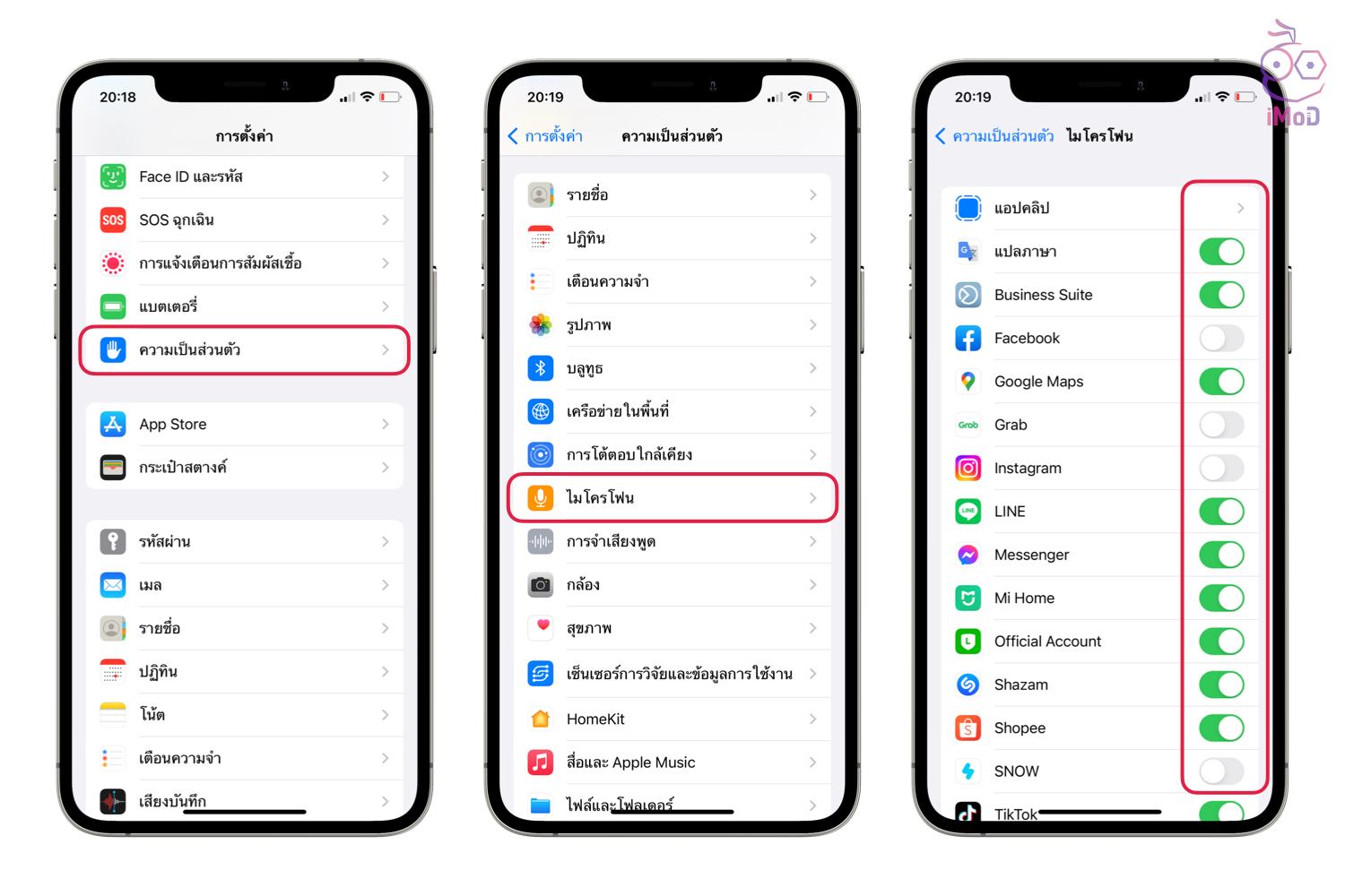 ไปที่ การตั้งค่า (Settings) > ความเป็นส่วนตัว (Privacy) > แตะการเข้าถึงส่วนต่าง ๆ ตัวอย่างเลือก ไมโครโฟน > ปิดใช้งาน แอปที่ไม่จำเป็นต้องใช้ไมโครโฟน