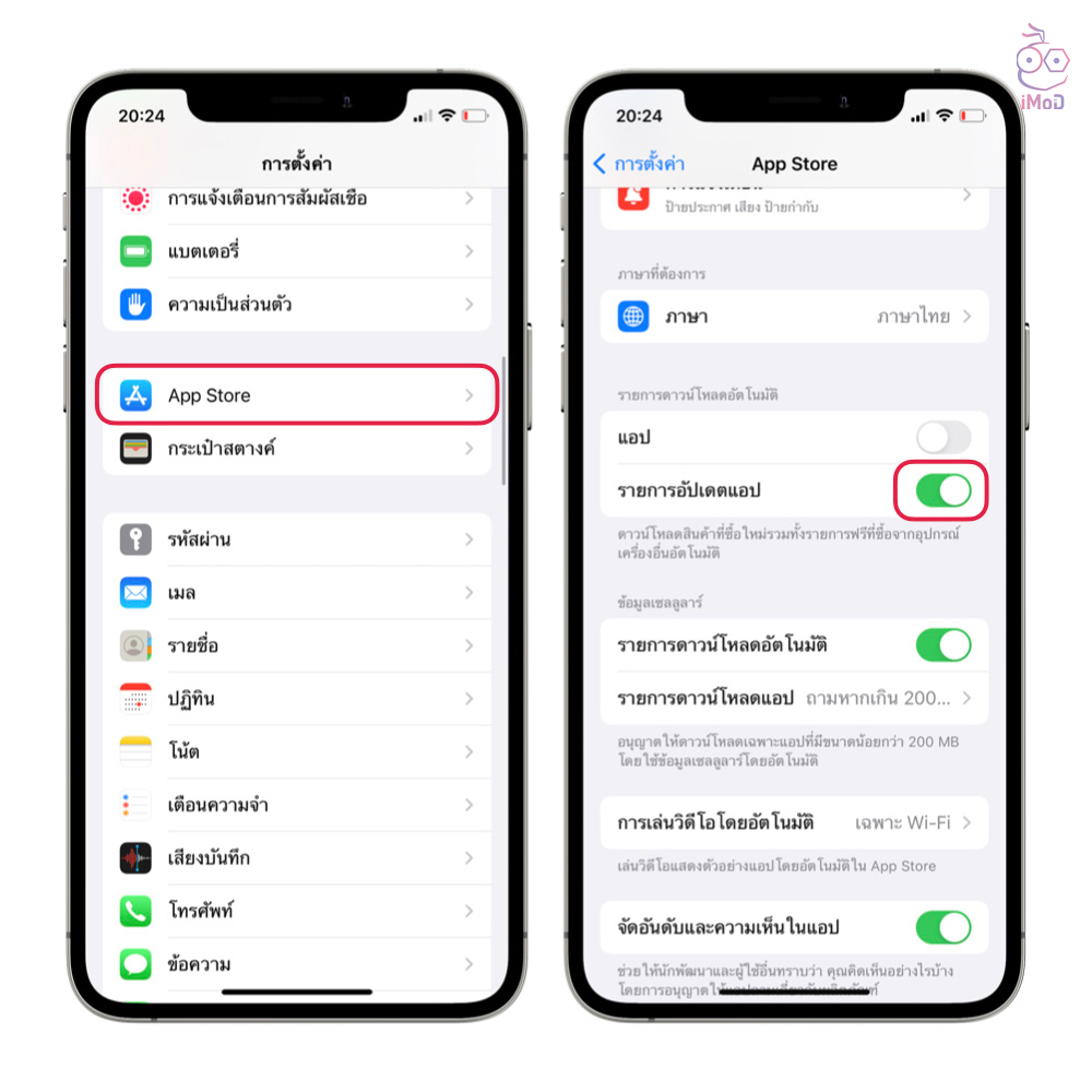 ไปที่ การตั้งค่า (Settings) > App Store > เปิด รายการอัปเดตแอป (App Updates)