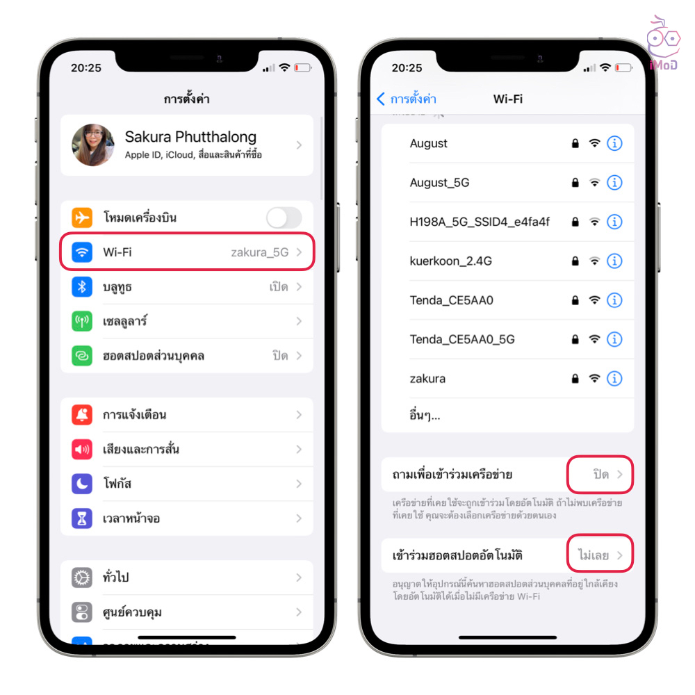 ไปที่ การตั้งค่า (Settings) > Wi-Fi > ปิด ถามเพื่อเข้าร่วมเครือข่าย (Ask to Join Networks) และปิด เข้าร่วมฮอตสปอตอัตโนมัติ (Auto-Join Hotspot)