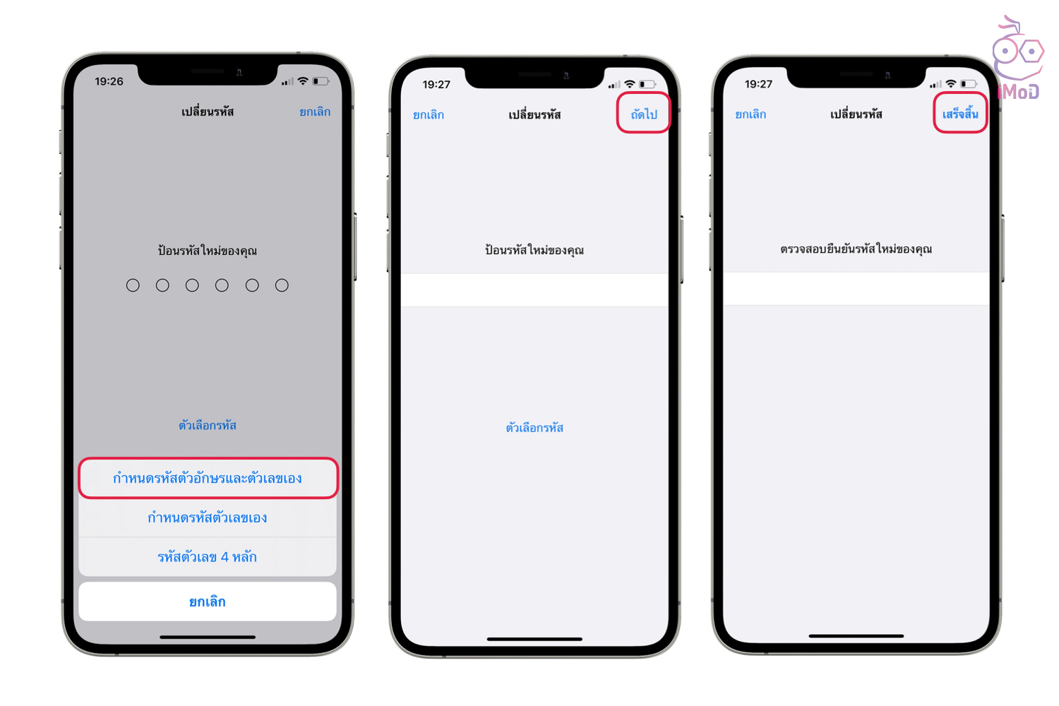 เลือก กำหนดรหัสตัวอักษรและตัวเลขเอง (Custom Alphanumeric Code) > ป้อนรหัสผ่านใหม่ ที่มีทั้งตัวอักษรและตัวเลข > แตะถัดไป พร้อมกับยืนยันรหัสผ่านใหม่อีกครั้ง แล้วแตะ เสร็จสิ้น