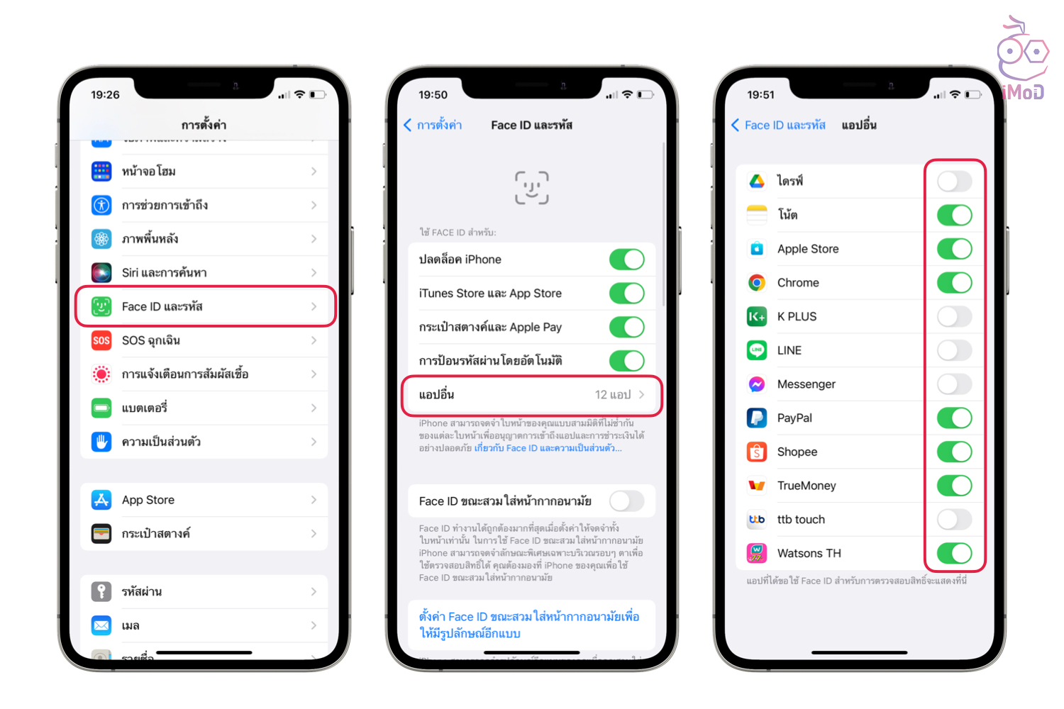 ไปที่ การตั้งค่า (Settings) > Face ID และรหัส (Face ID & Passcode) > แอปอื่น (Other Apps) > ปิดการสแกน Face ID หรือ Touch ID แอปที่ต้องการความปลอดภัย