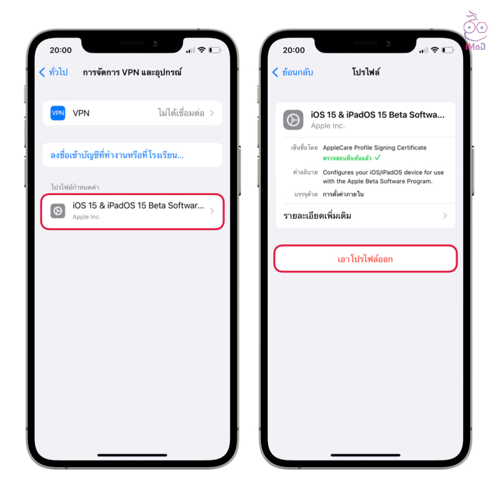 ก็ลองตรวจสอบดูว่ามีโปรไฟล์อื่น ๆ ที่ไม่รู้จักหรือไม่ ถ้าเราใช้โปรไฟล์ iOS Beta หรือโปรไฟล์ขององค์กรที่เราต้องใช้ทำงาน ก็ไม่ต้องลบออกนะคะ ลบแค่ที่ไม่จำเป็นต้องใช้เท่านั้นเอง