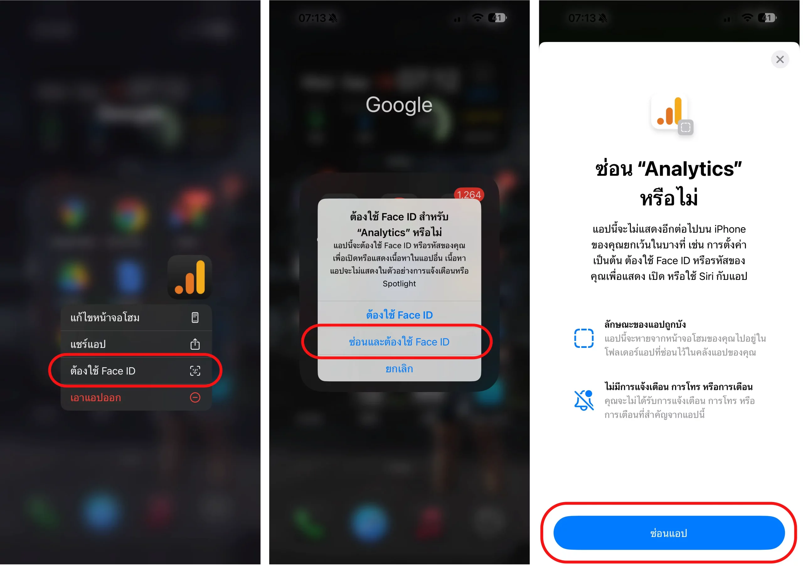 แตะแอปที่ต้องการซ่อนค้างไว้ > เลือก “ต้องใช้ Face ID” > แตะ “ซ่อนและต้องใช้ Face ID” > แตะ “ซ่อนแอป”