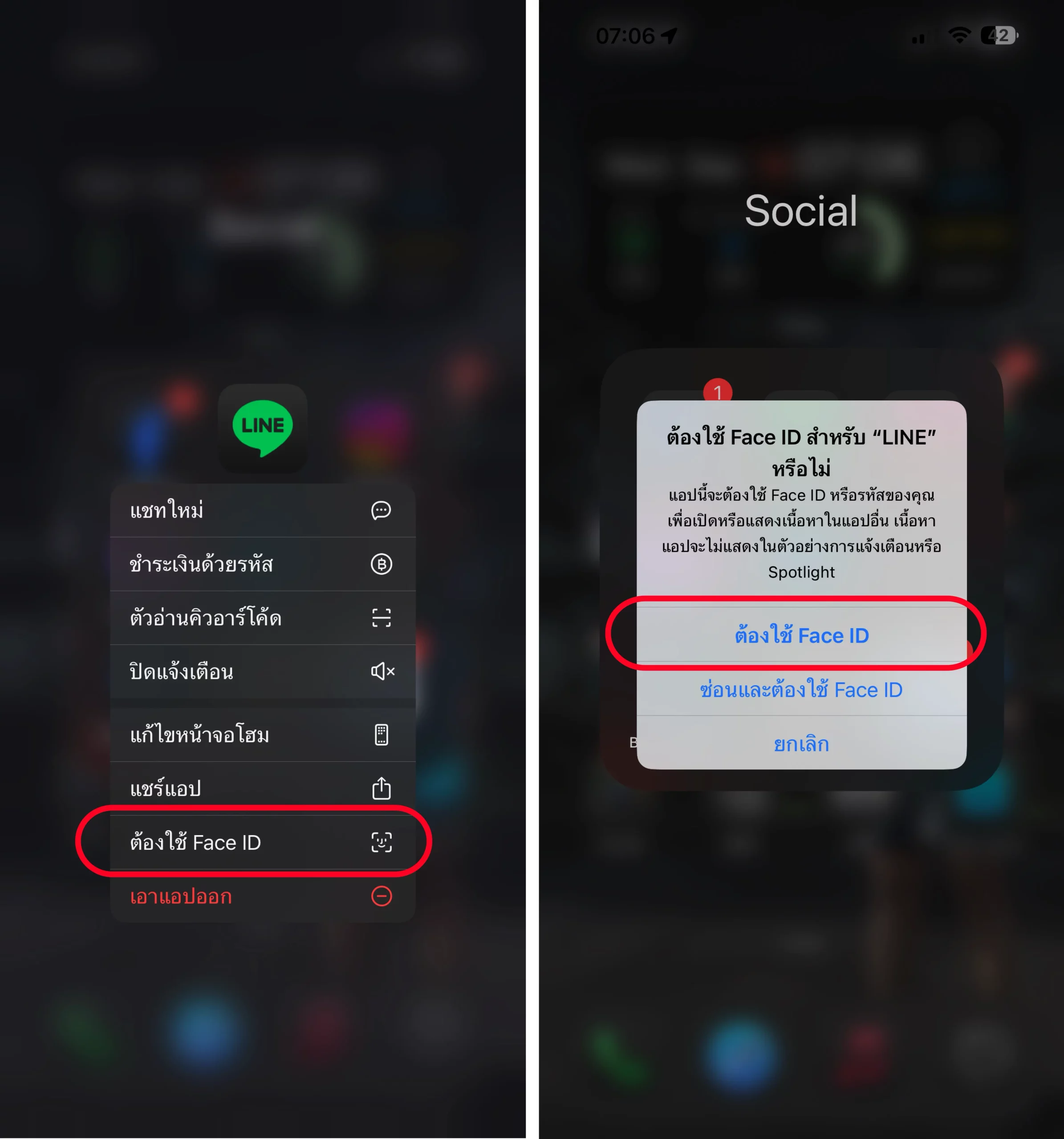 แตะแอปที่ต้องการล็อคค้างไว้ > เลือก “ต้องใช้ Face ID” > แตะ “ต้องใช้ Face ID”
