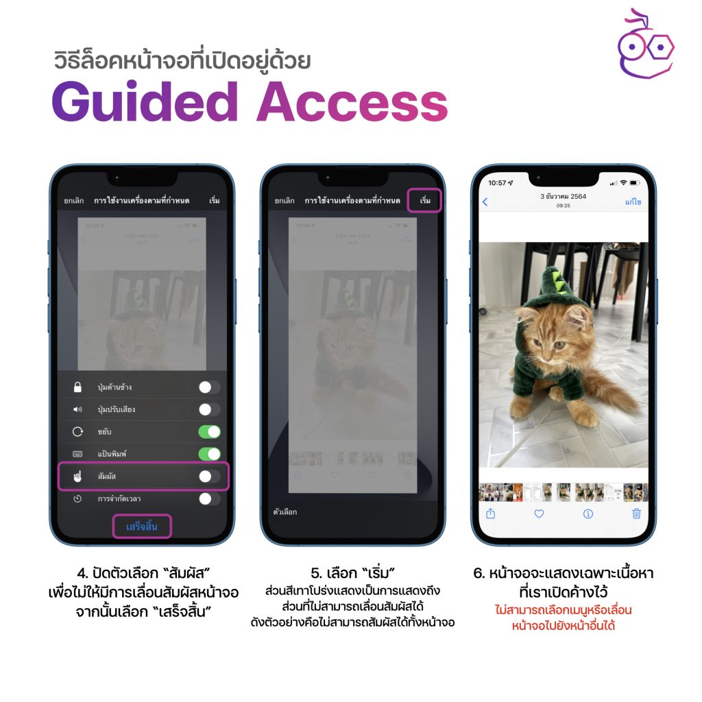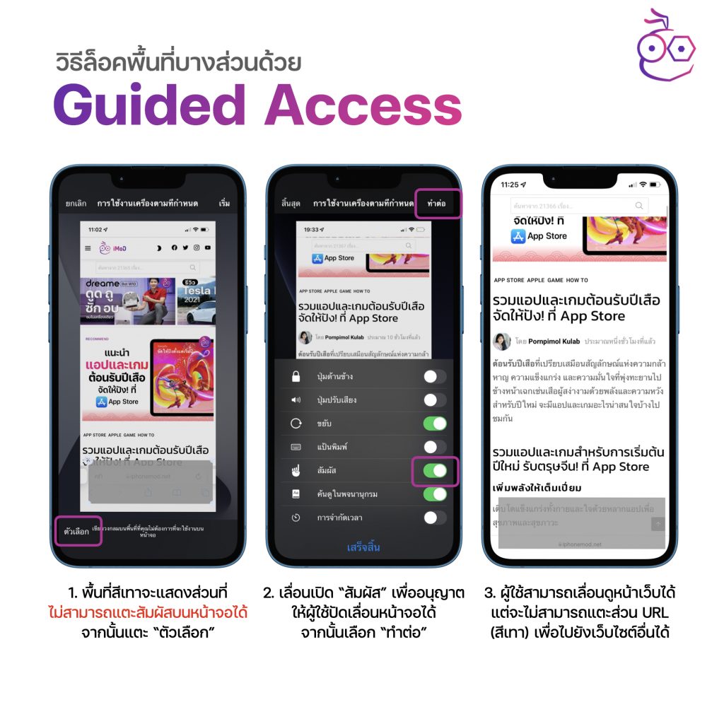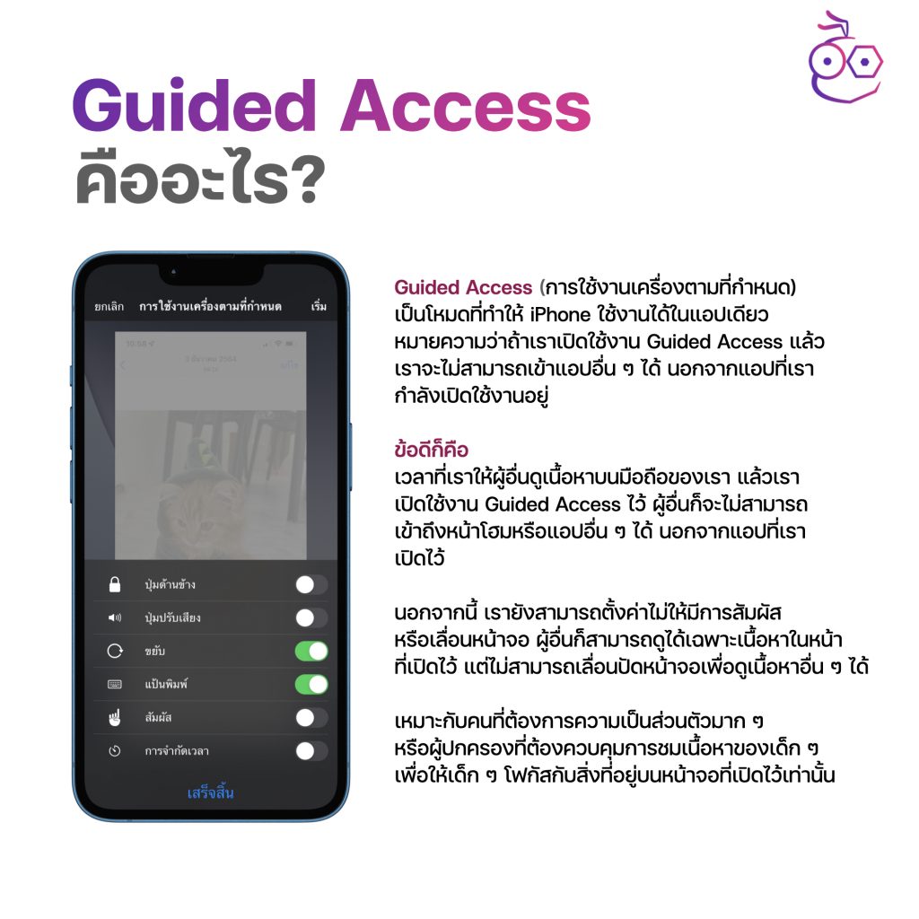 ข้อดีก็คือ เวลาที่เราให้ผู้อื่นดูเนื้อหาบนมือถือของเรา แต่ต้องการจำกัดความเป็นส่วนตัวหรือควบคุมไม่ให้ผู้อื่นเข้าแอปอื่น ๆ หรือยุ่งกับการจัดการข้อมูลบนหน้าจอ ก็สามารถเปิด Guided Access และตั้งค่าการควบคุมได้