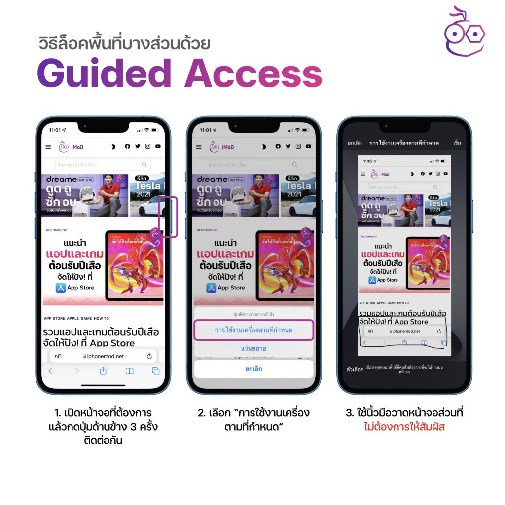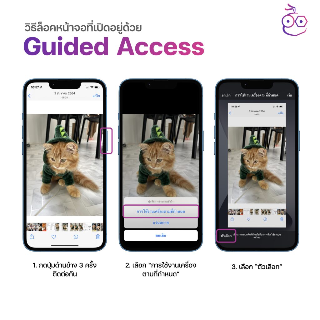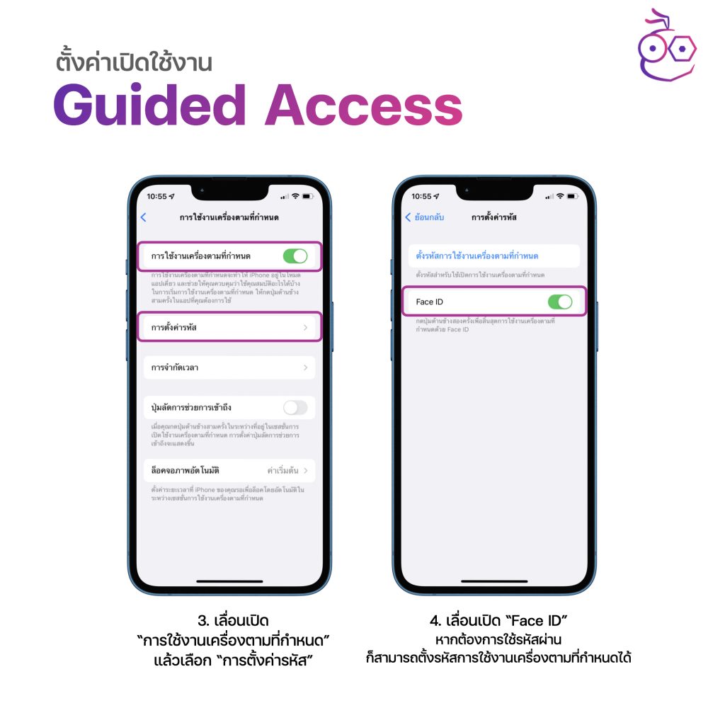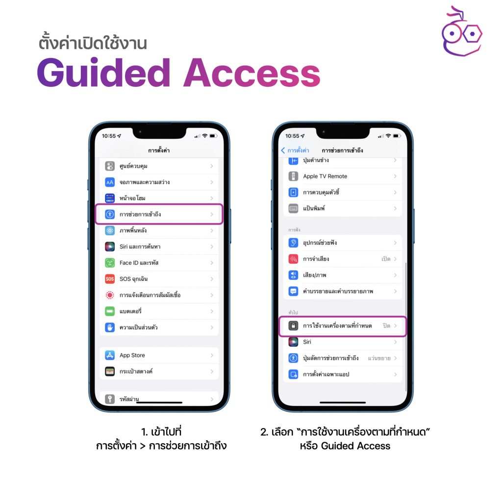 Guided Access (การใช้งานเครื่องตามที่กำหนด) เป็นโหมดที่ทำให้ iPhone ใช้งานได้ในแอปเดียว ถ้าเราเปิดใช้งาน Guided Access แล้ว เราจะไม่สามารถเข้าแอปอื่น ๆ ได้ นอกจากแอปที่เรา กำลังเปิดใช้งานอยู่ โดยผู้ใช้สามารถตั้งค่าได้ด้วยว่าเมื่อใช้งาน Guided Access อยู่จะอนุญาตให้กดปุ่มอะไรได้บ้าง หรืออนุญาตให้เลื่อนสัมผัสหน้าจอได้หรือไม่