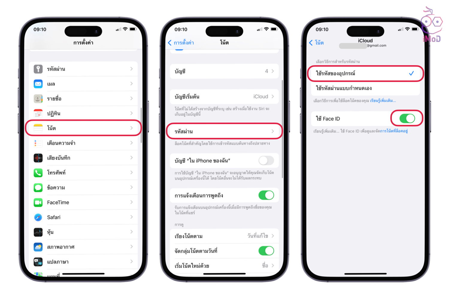 ไปที่ การตั้งค่า (Settings) > โน้ต (Note) > รหัสผ่าย (Password) > แตะเลือก ใช้รหัสของอุปกรณ์ (หากต้องการปลดล็อกด้วย Face ID ก็สามารถแตะเปิดได้)