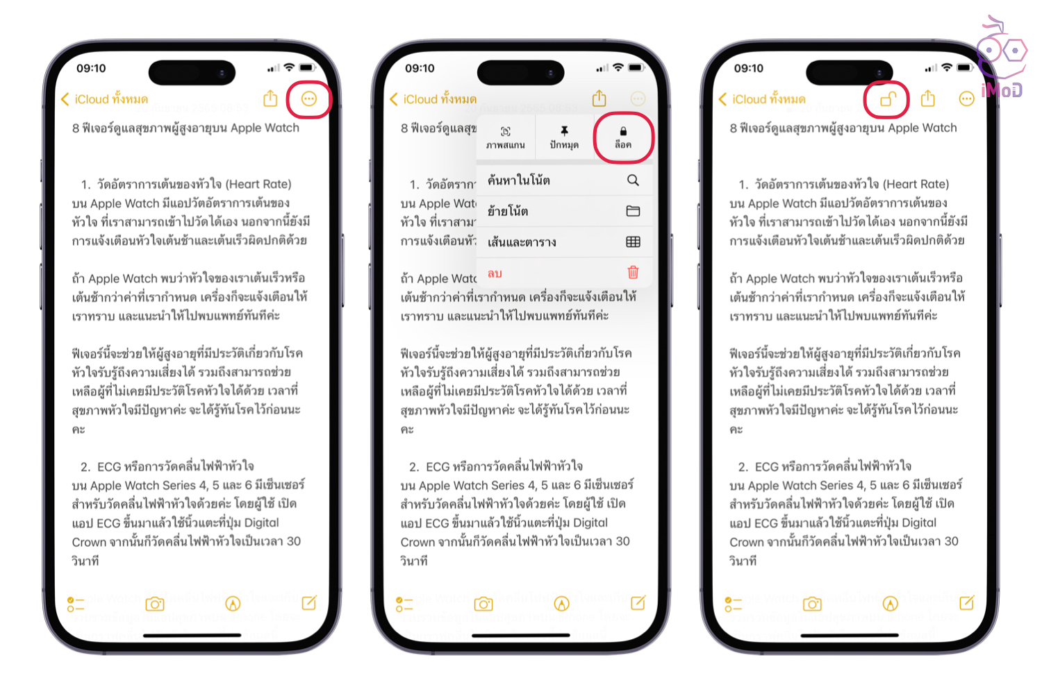 จากนั้นก็ไปที่แอปโน้ต (Note) และไปยังโน้ตที่เราต้องการล็อก > แตะไอคอน 3 จุด ด้านมุมบนขวา > แตะไอคอน ล็อก > เราก็จะเห็นไอคอนล็อกปรากฏอยู่ด้านบนขอโน้ต