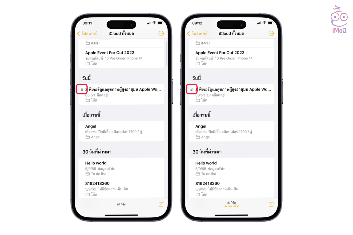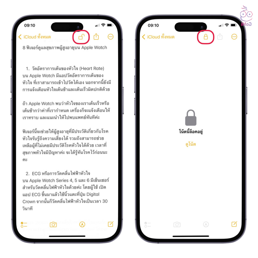 ข้อสังเกต โน้ตไหนที่มีการตั้งค่าล็อกไว้จจะมีไอคอนล็อกอยู่ด้านหน้า หากเป็นสัญลักษณ์แม่กุญแจล็อกแสดงว่าโน้ตนั้นถูกล็อกอยู่ จำเป็นต้องปลดล็อกก่อนดูโน้ต แต่ถ้าหากเป็นสัญลักษณ์แม่กุญแจไม่ได้ล็อกแสดงว่าโน้ตนั้นถูกปลดล็อกอยู่ สามารถเข้าดูได้โดยไม่ต้องสแกน Face ID หรือกรอกรหัสผ่าน หากต้องการล็อกก็เข้าไปแตะที่ไอคอนล็อกด้านบนโน้ตได้เลย