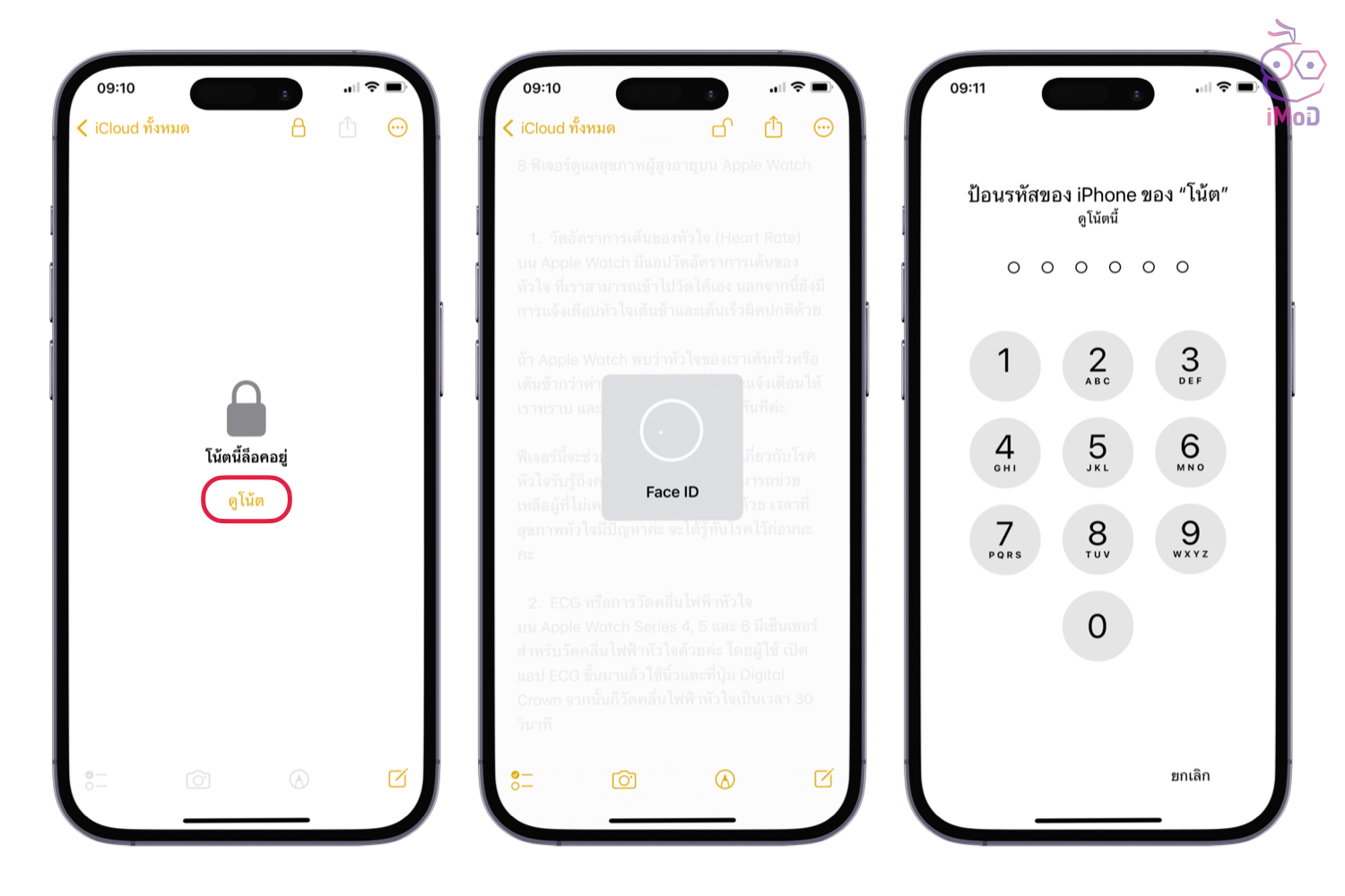 หากต้องการปลดล็อกก็แตะ ดูโน้ต > จากนั้นก็สแกน Face ID (ถ้าเปิดใช้งานไว้) หากไม่ได้เปิดใช้งาน Face ID ก็กรอกรหัสผ่านปลดล็อกเครื่อง iPhone ได้เลย