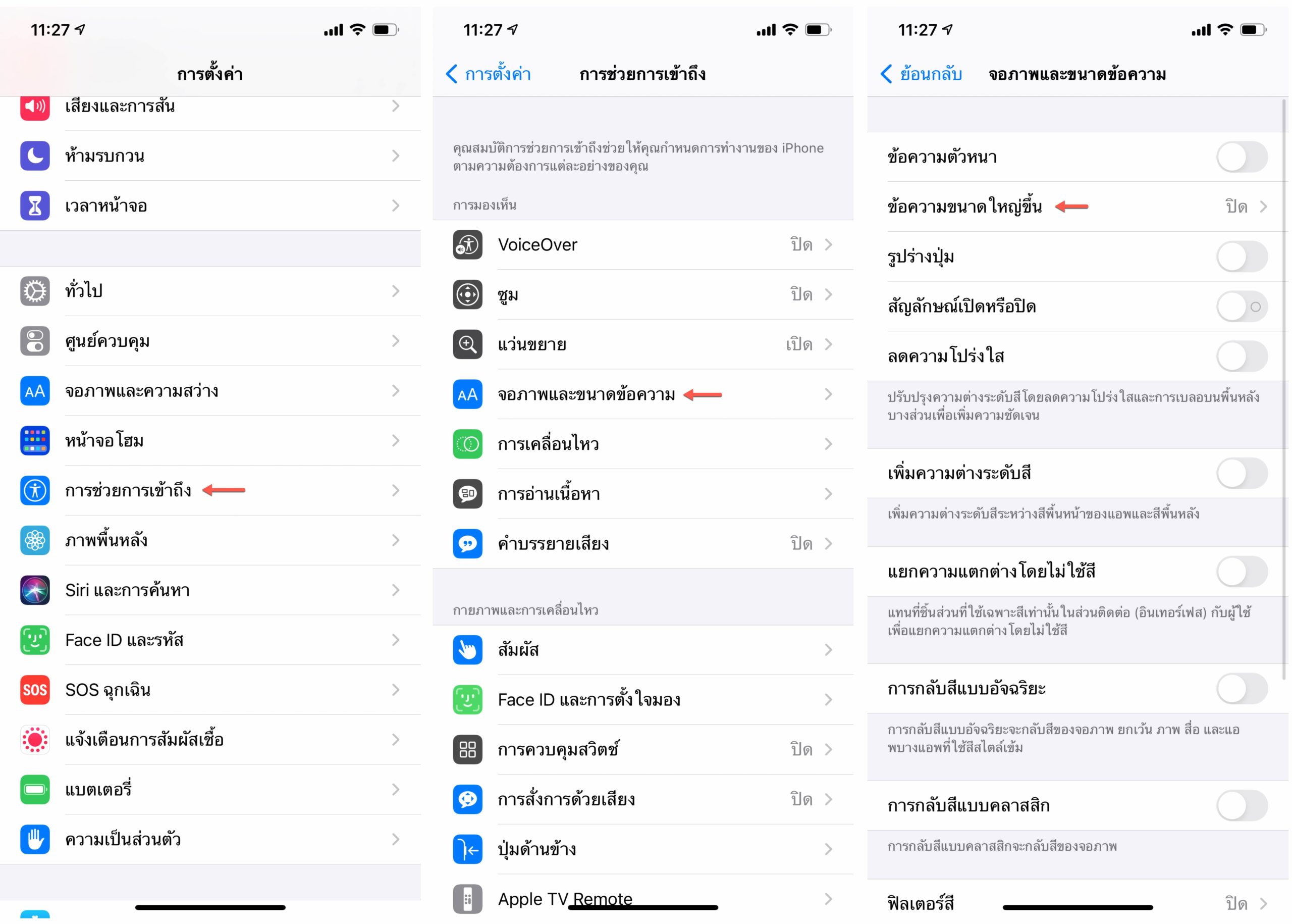 ไปที่ การตั้งค่า > การช่วยการเข้าถึง > จอภาพและขนาดข้อความ > ข้อความขนาดใหญ่ขึ้น