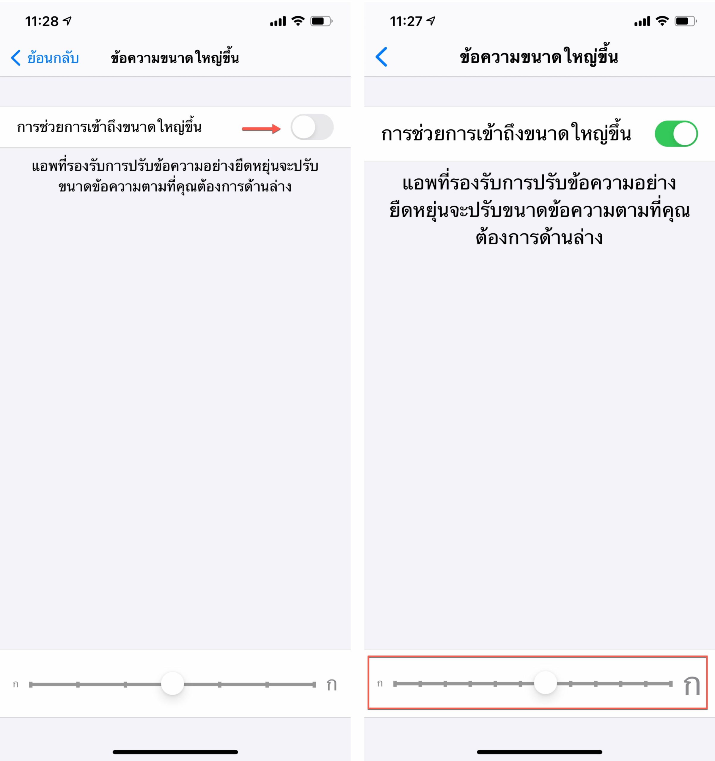 เลื่อนเปิด การช่วยการเข้าถึงขนาดใหญ่ขึ้น > ปรับเลื่อนขนาดข้อความตามต้องการ