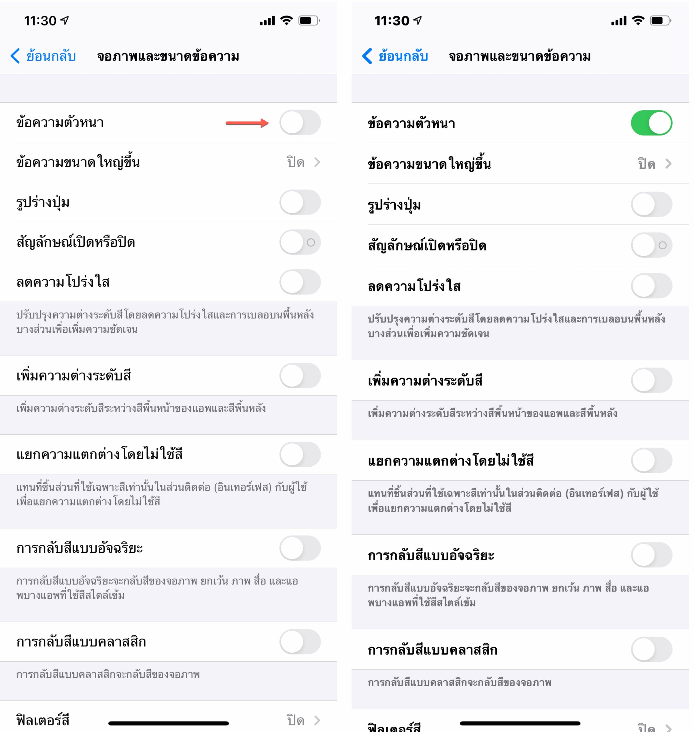 ไปที่ การตั้งค่า > การช่วยการเข้าถึง > จอภาพและขนาดข้อความ > เลื่อนเปิด ข้อความตัวหนา