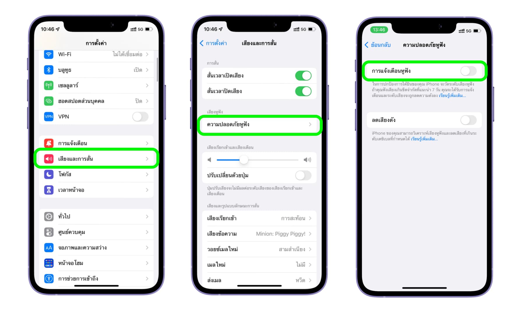 ไปที่การตั้งค่า > เสียงและการสั่น > ความปลอดภัยหูฟัง > ปิด “การแจ้งเตือนหูฟัง”