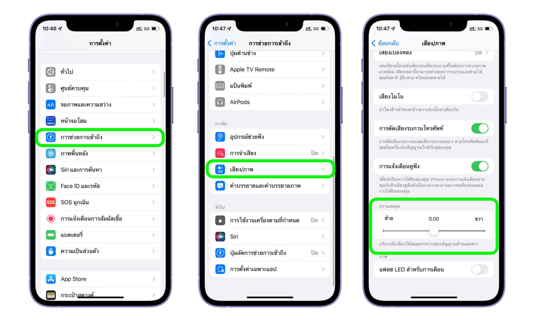 เข้าไปที่ การตั้งค่า > การช่วยการเข้าถึง > เสียง/ภาพ > ที่เมนู ความสมดุล ให้ลากตัวเลื่อนไปทางซ้ายหรือขวาเพื่อให้เสียงข้างที่เราต้องการดังขึ้น